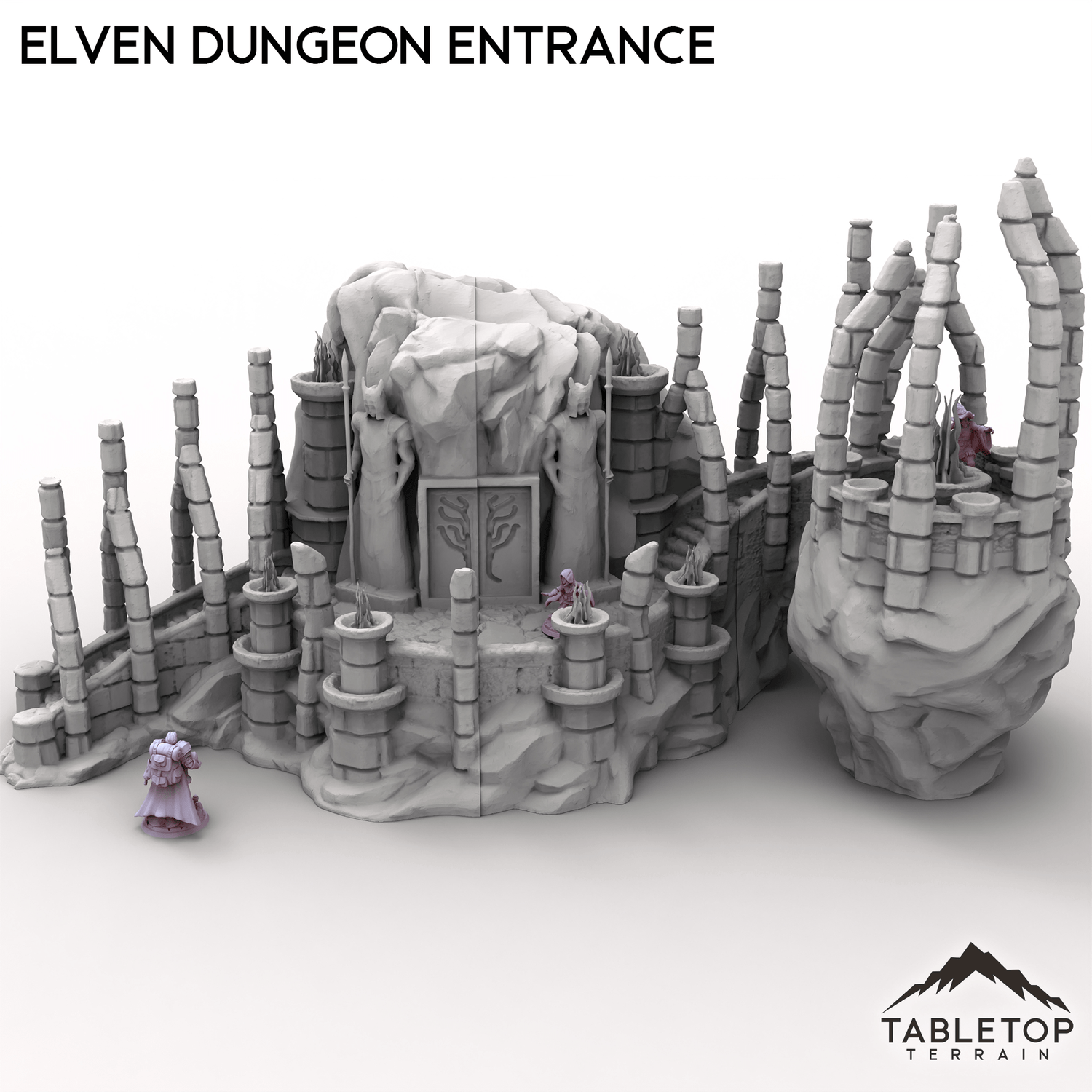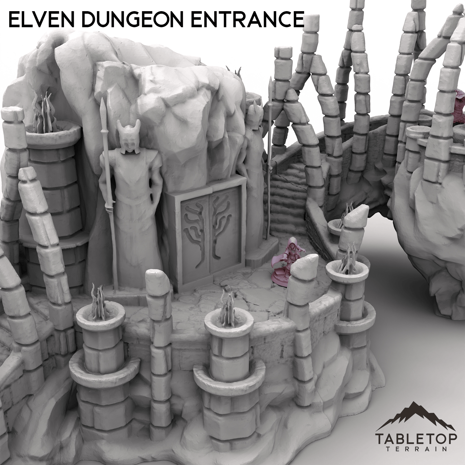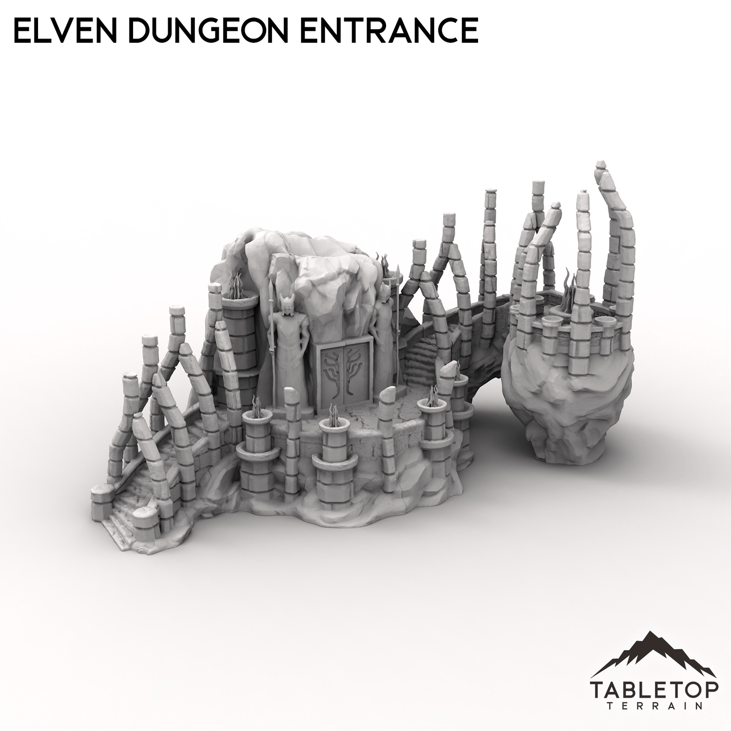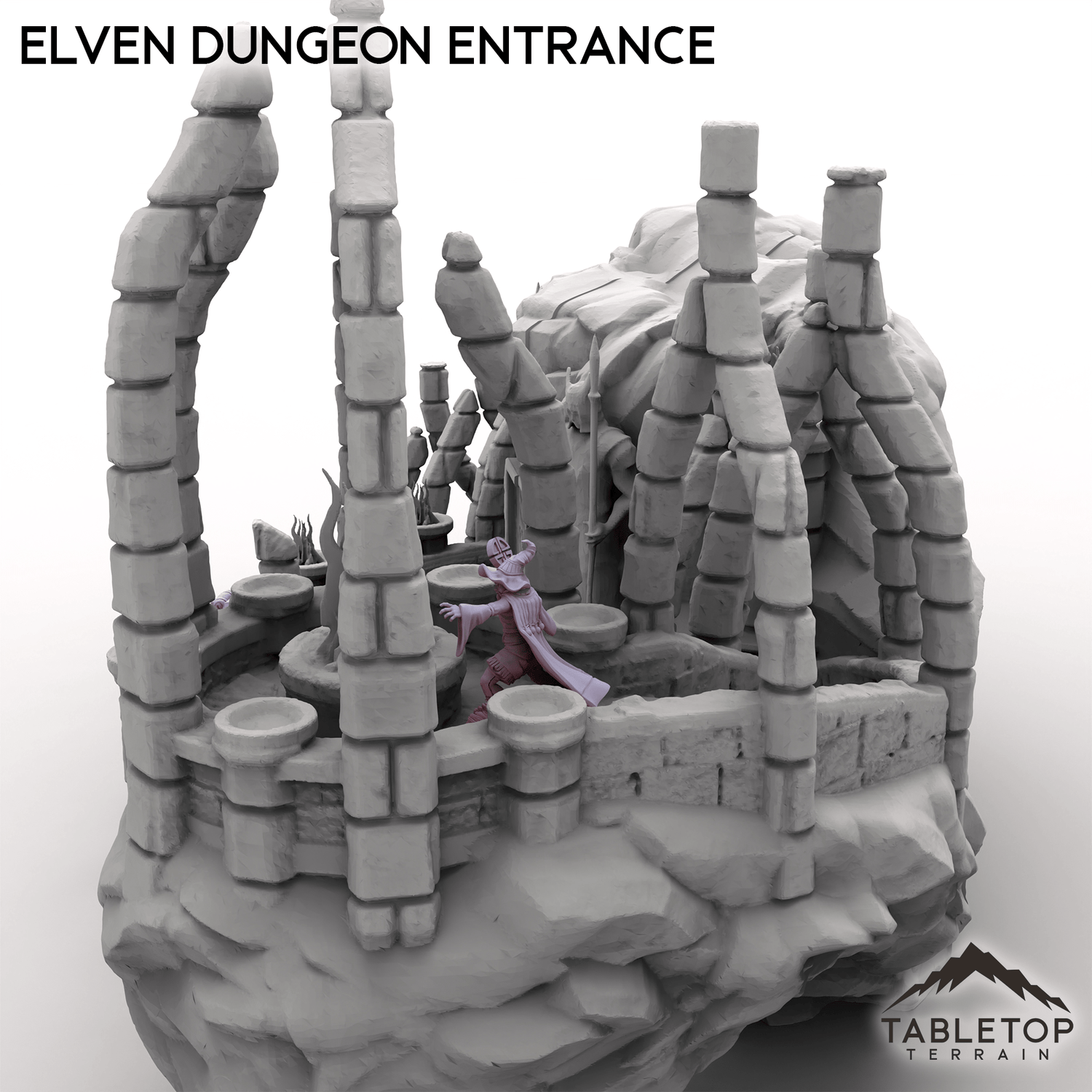 This Elven Dungeon Entrance is carved into a sheer rock face, with winding stone paths flanked by twisted pillars. Elegant doors stand at its center, blending natural grace with foreboding mystery.