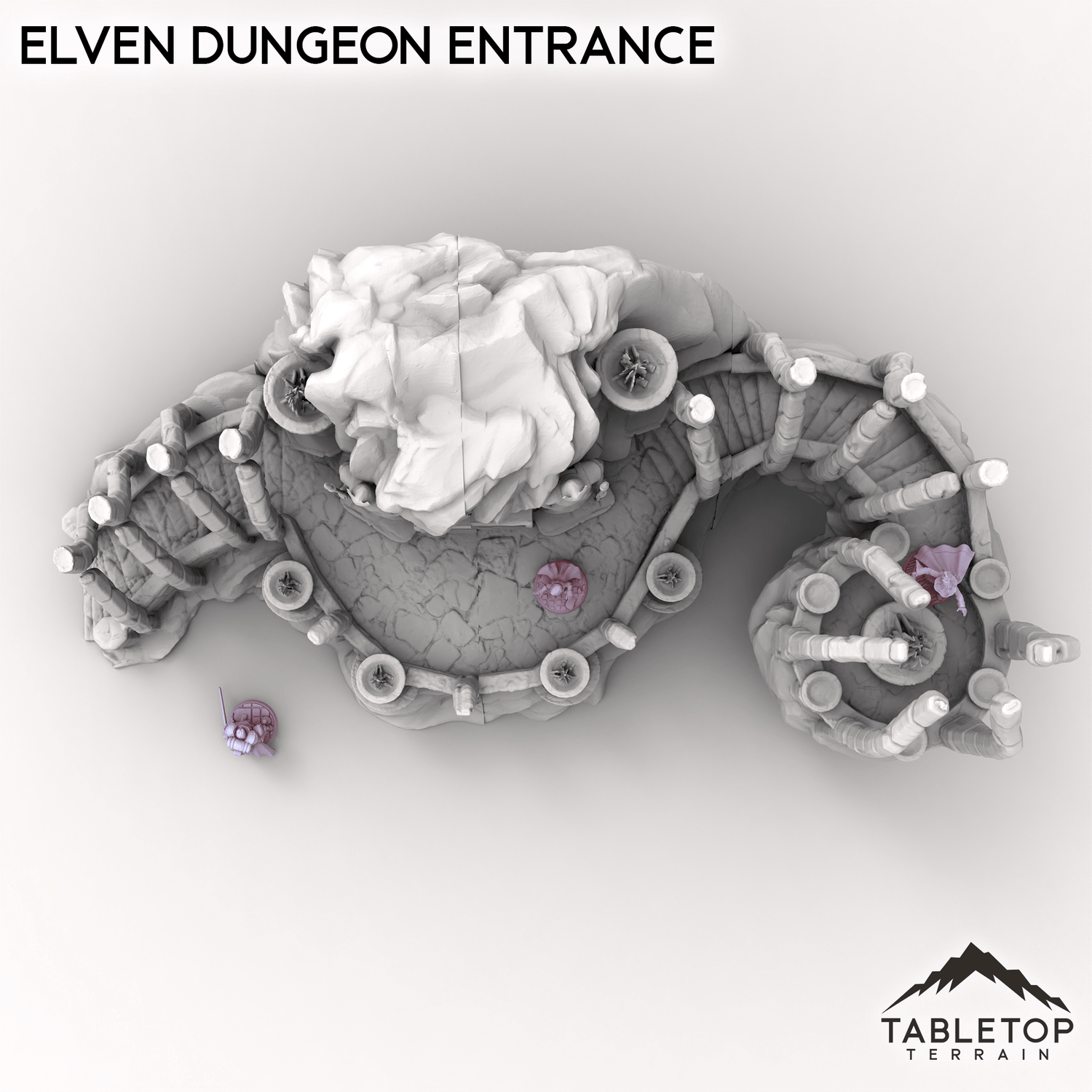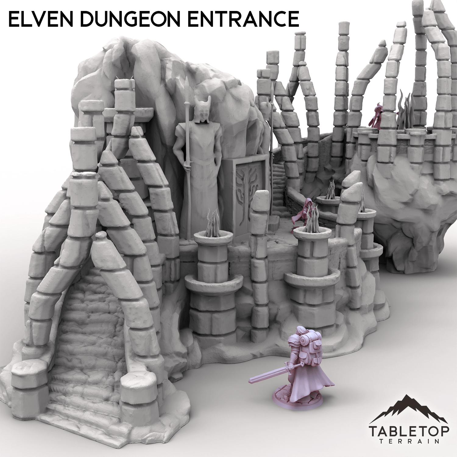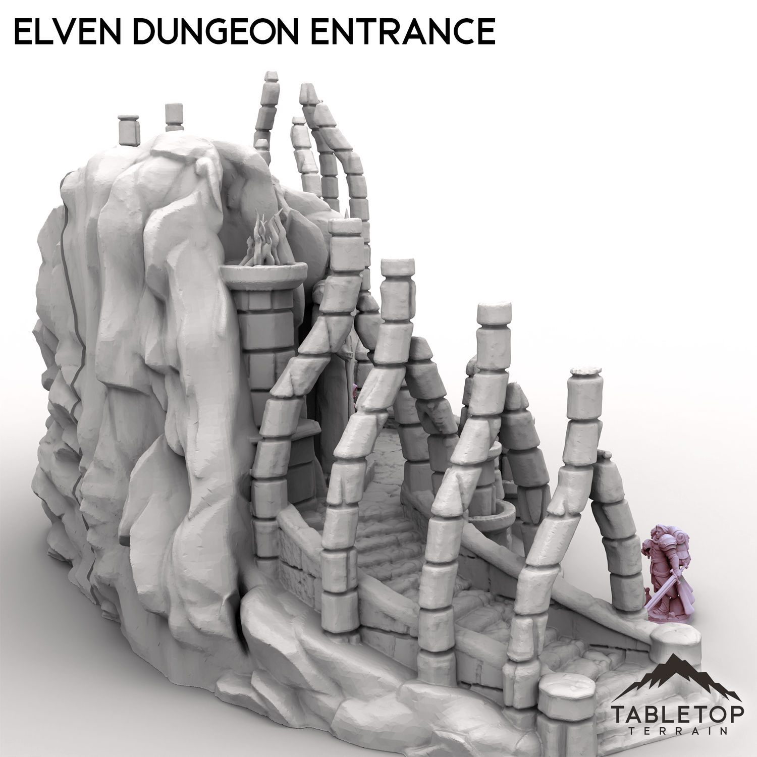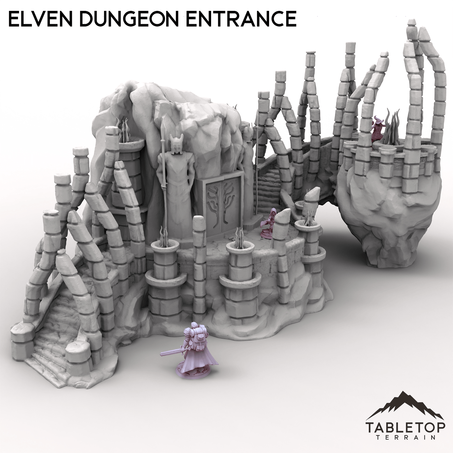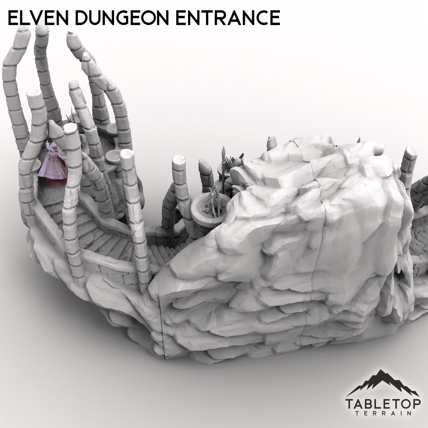 This Elven Dungeon Entrance is carved into a sheer rock face, with winding stone paths flanked by twisted pillars. Elegant doors stand at its center, blending natural grace with foreboding mystery.