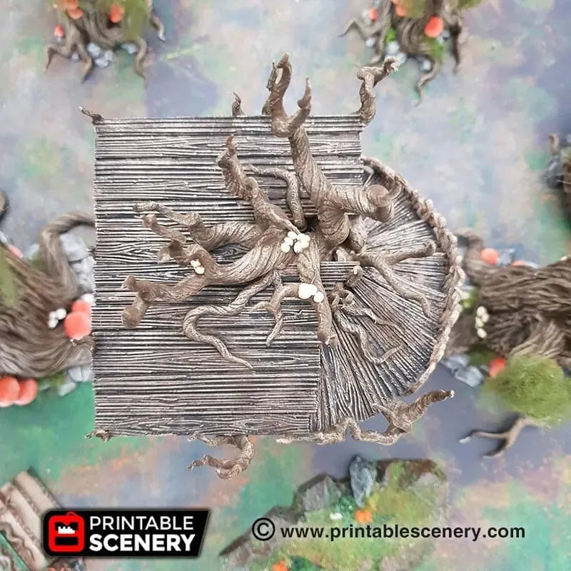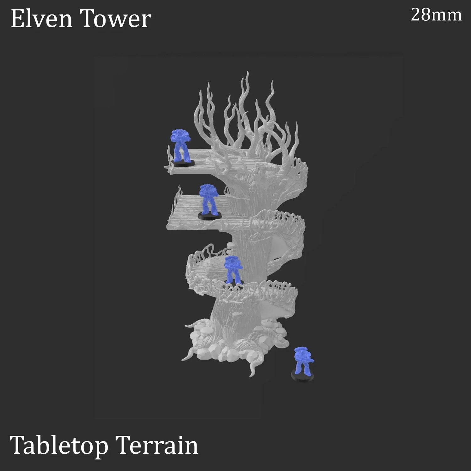 The Elven Tower is a large Gloomwood tree with three tiers. It features a staircase that wraps around the tree with two landings for docking airships. The Tower would be perfect for fantasy games such as Dungeons and Dragons (DND), Age of Sigmar (AoS), Pathfinder, Frostgrave, or Conquest.