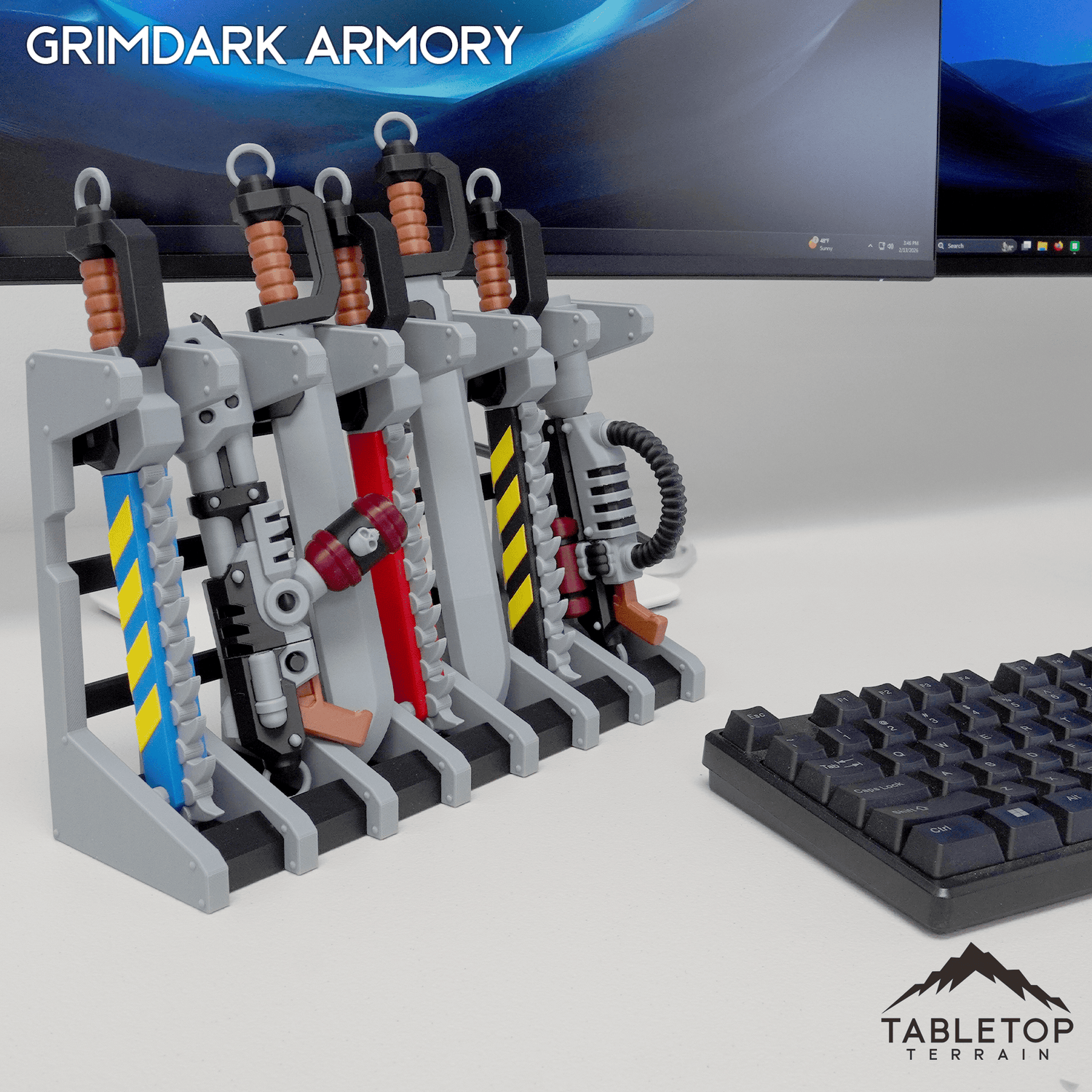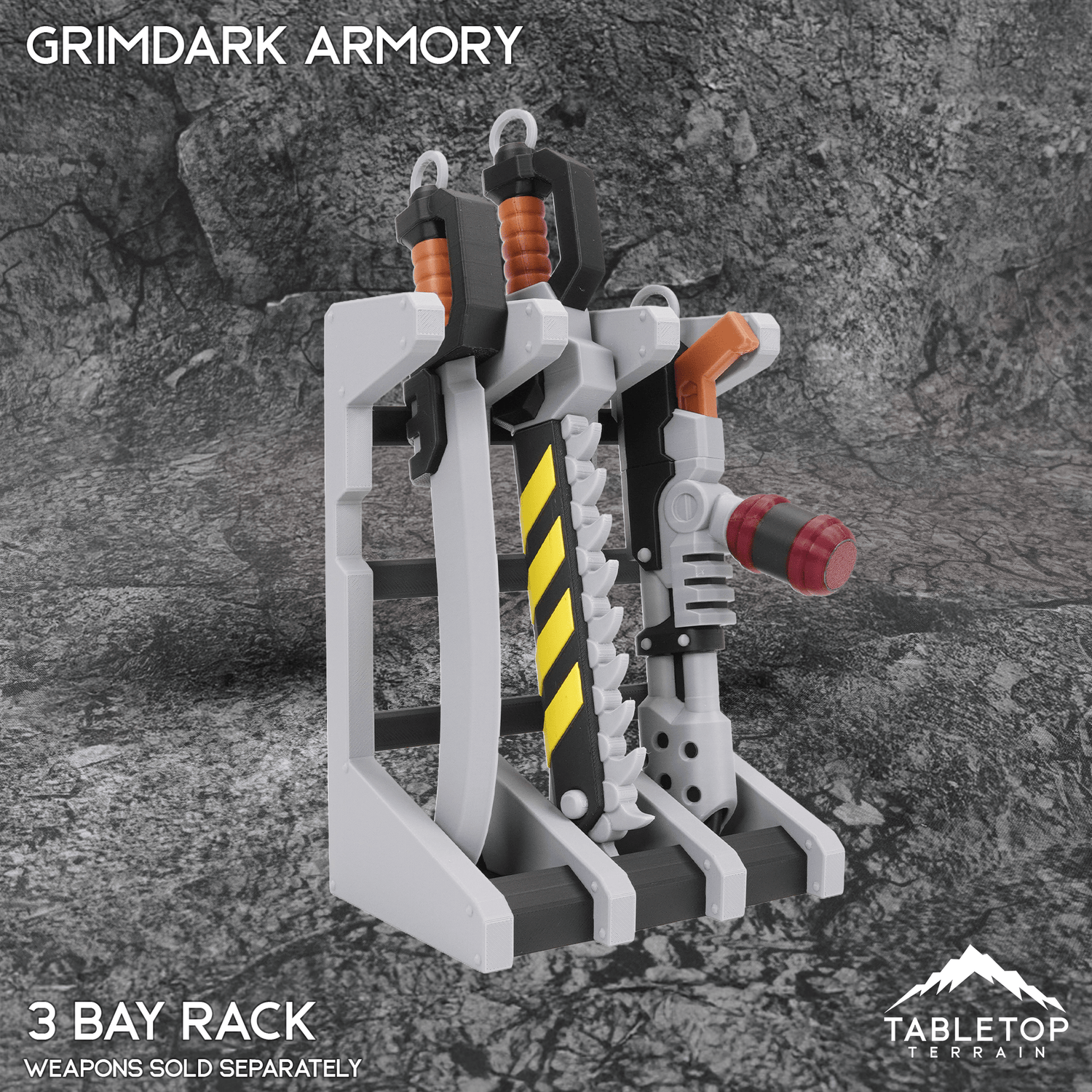 Grimdark Armory Weapon Prop Bays are available in 3, 5, and 7 bay sizes. These displays can slot on your desk or end-table to show off your arsenal.