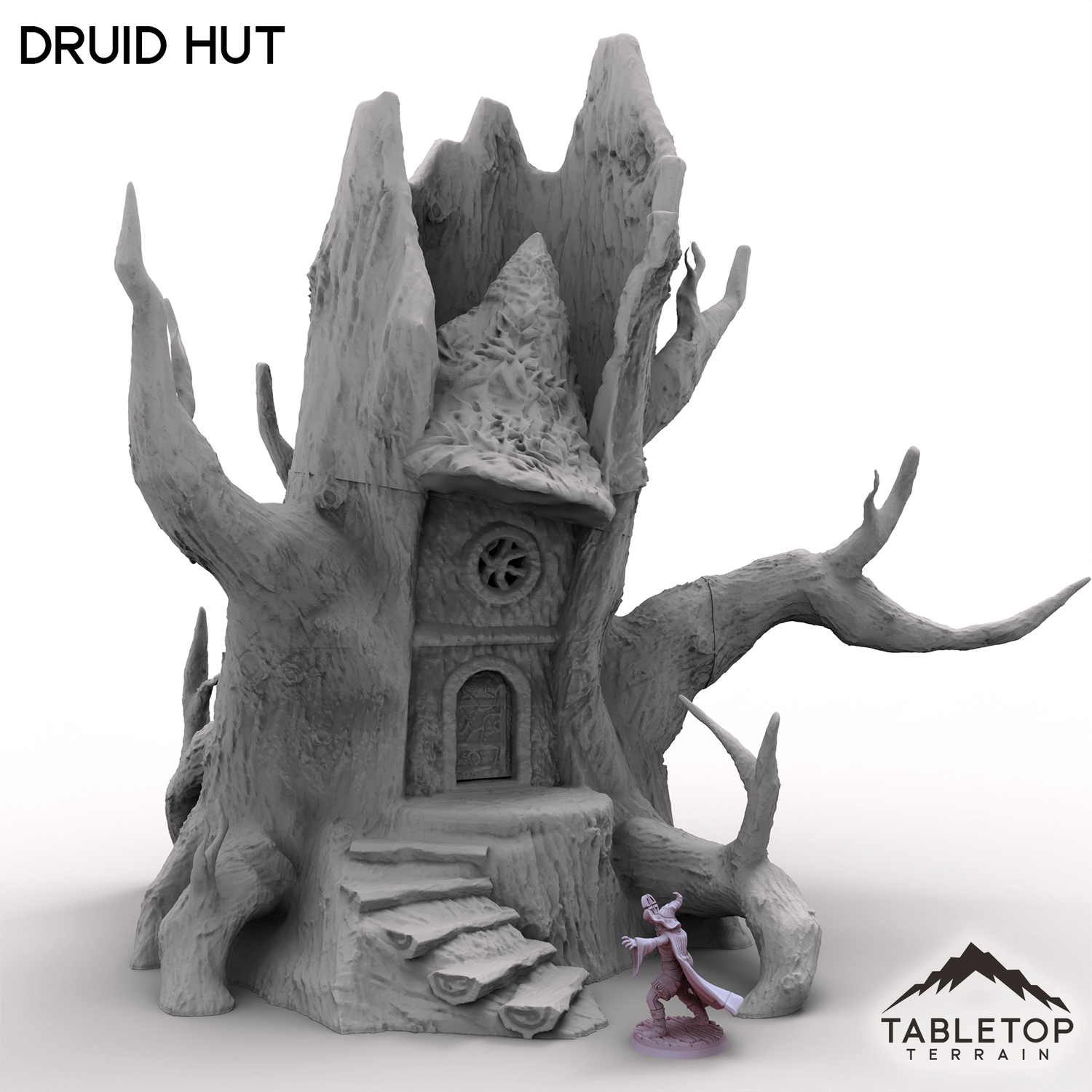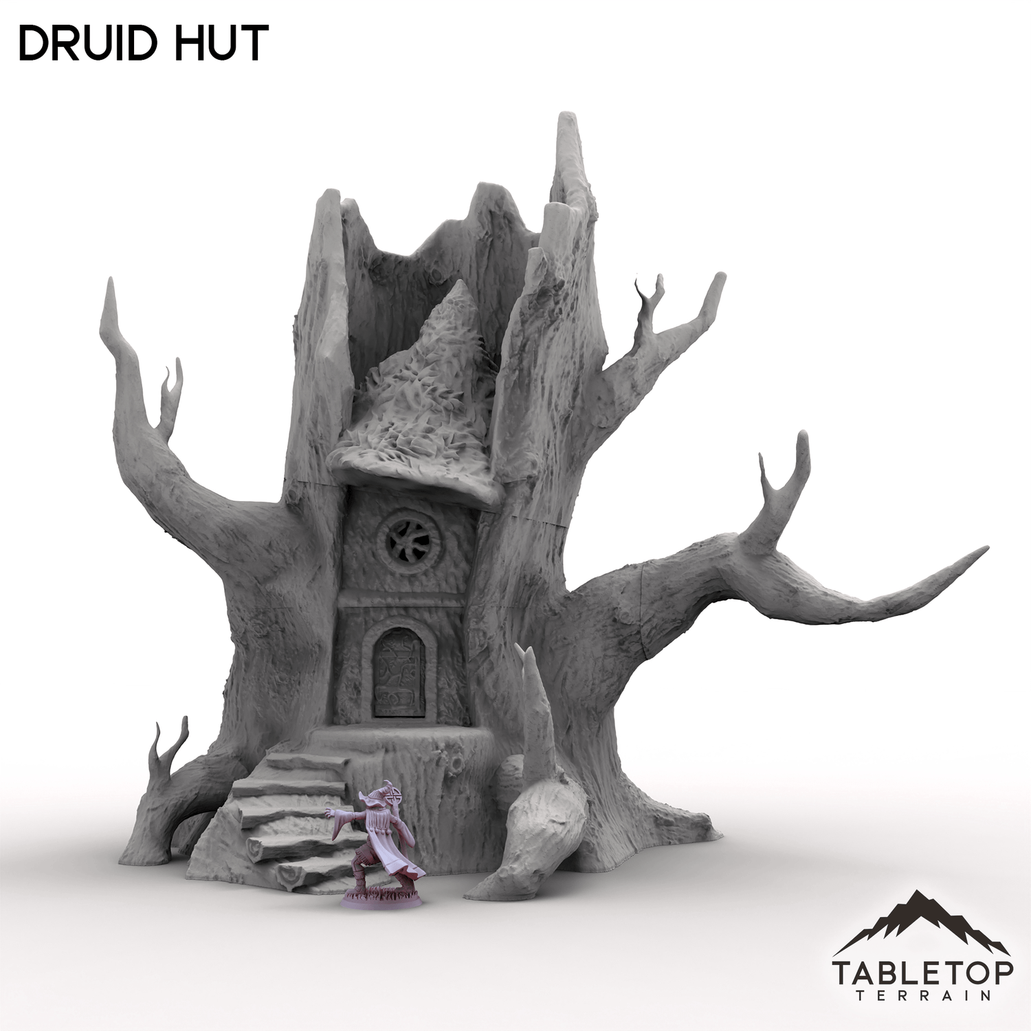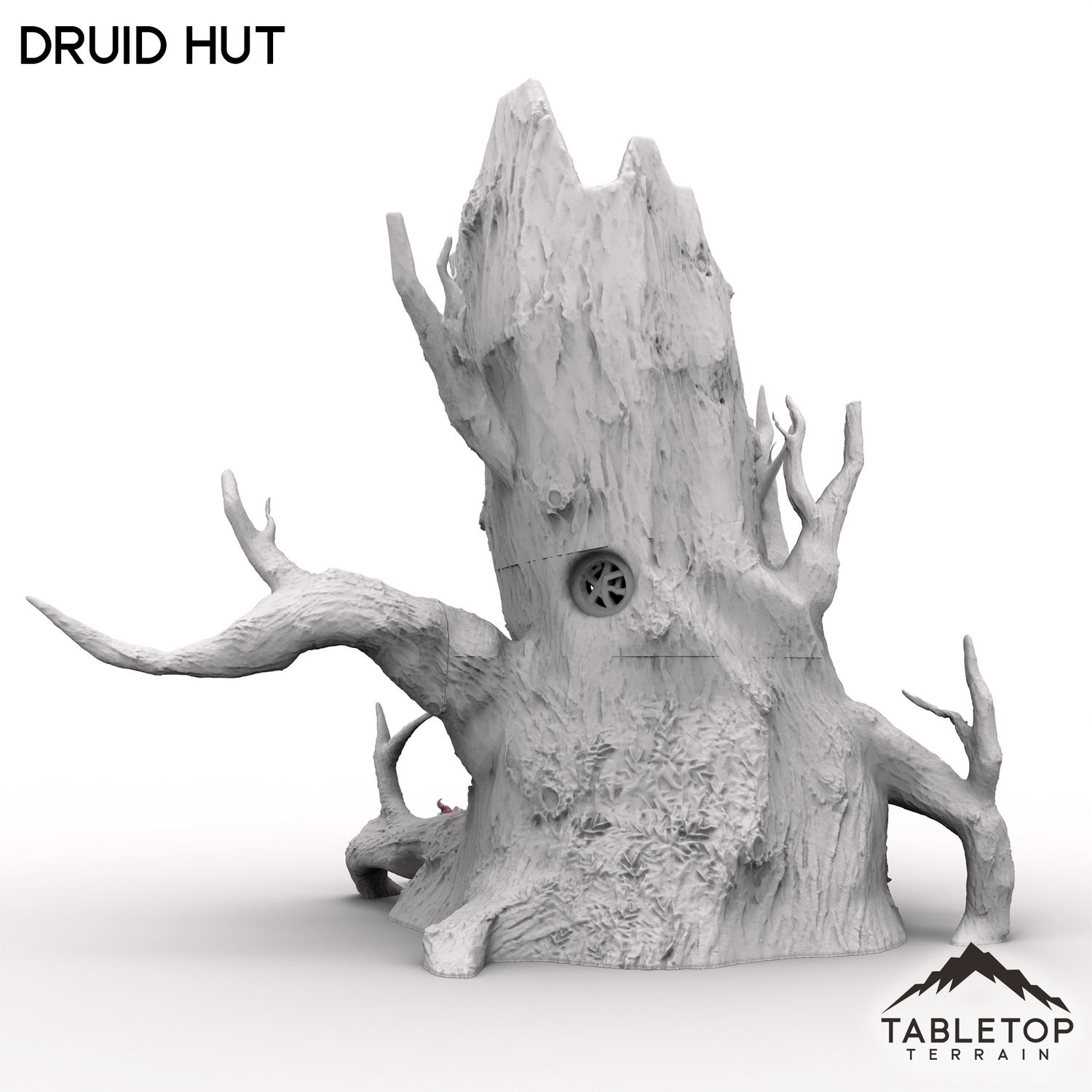 This Druid Hut was grown from the hollowed stump of an ancient tree. Gnarled roots curve outward to form the base and a twisting staircase leads to a vine-framed entrance door. Crooked limbs stretch like protective arms around the structure. Perfect home for a reclusive druid or eccentric witch.