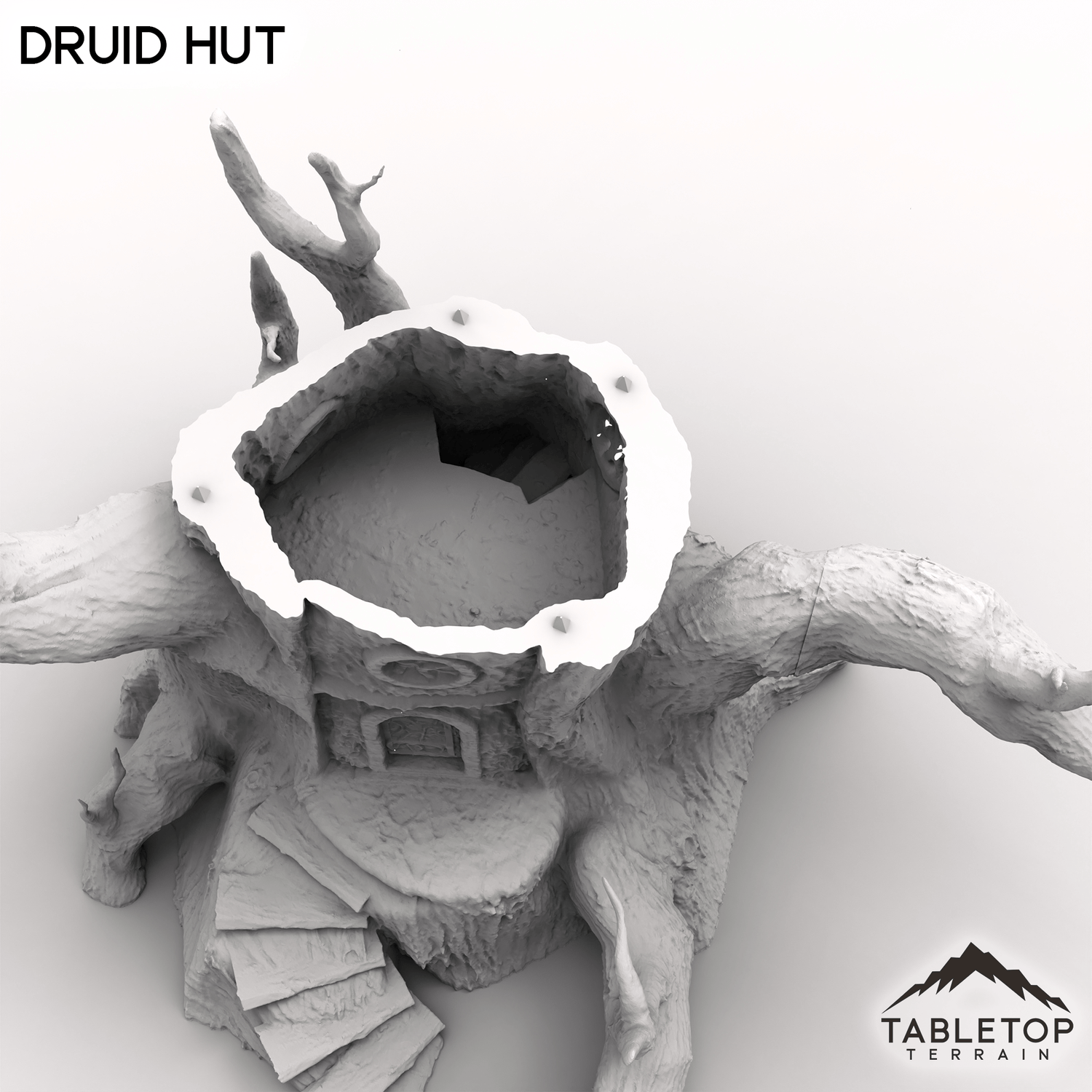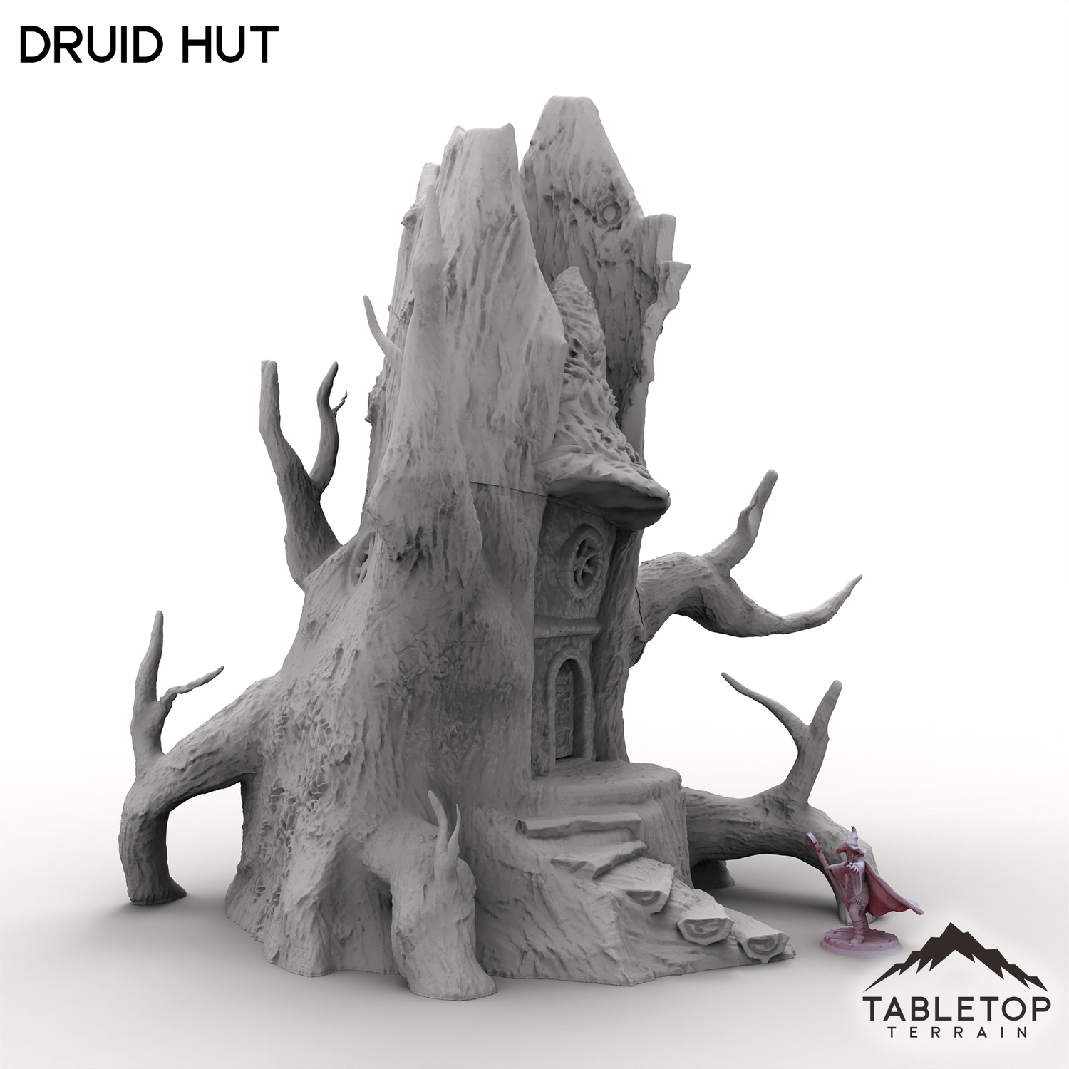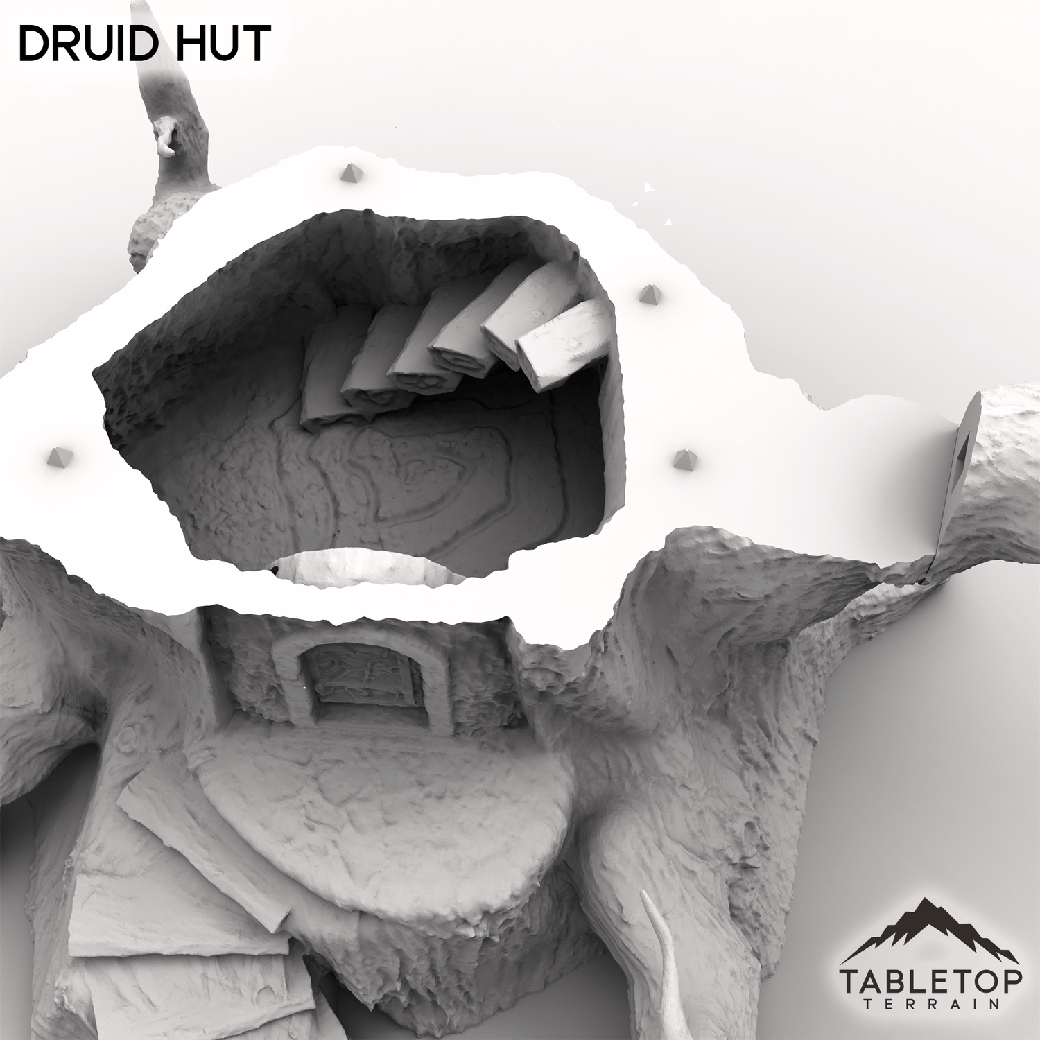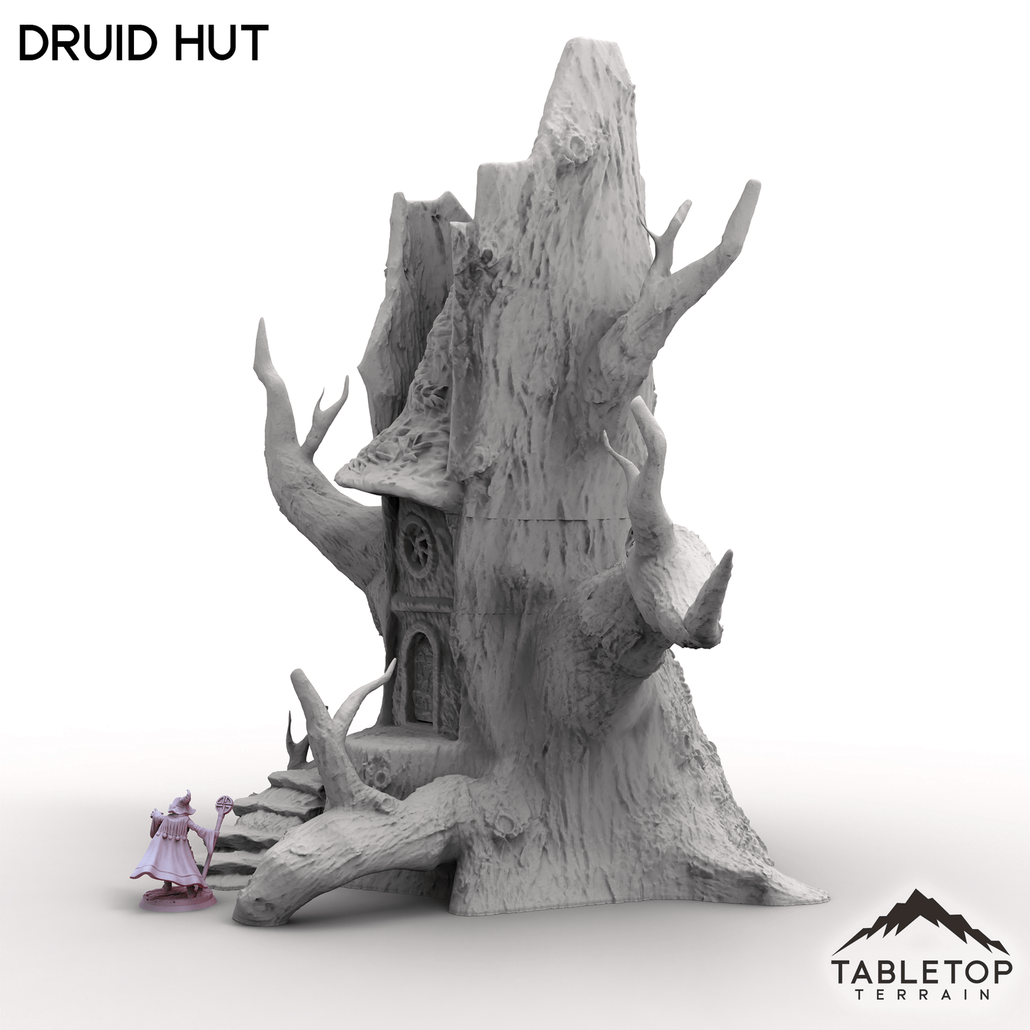 This Druid Hut was grown from the hollowed stump of an ancient tree. Gnarled roots curve outward to form the base and a twisting staircase leads to a vine-framed entrance door. Crooked limbs stretch like protective arms around the structure. Perfect home for a reclusive druid or eccentric witch.