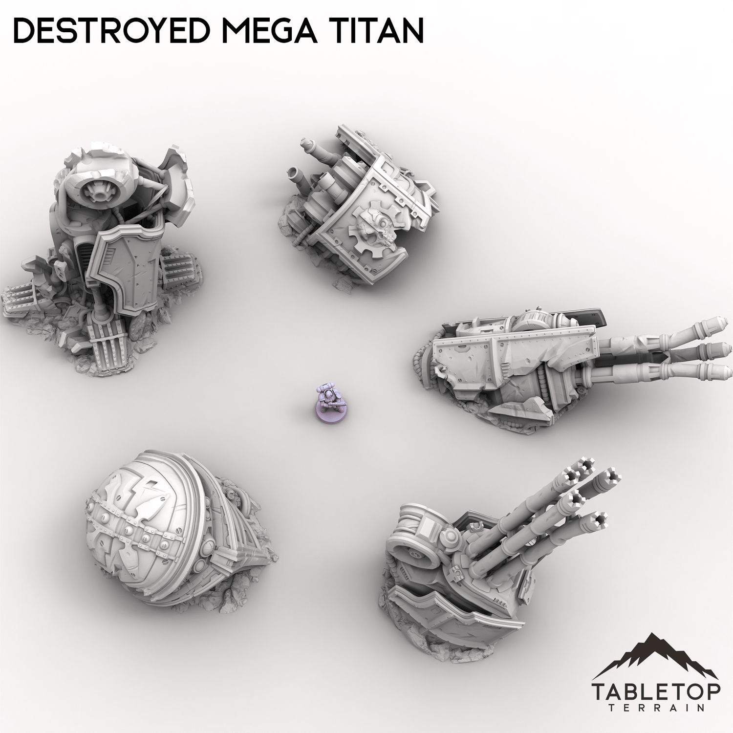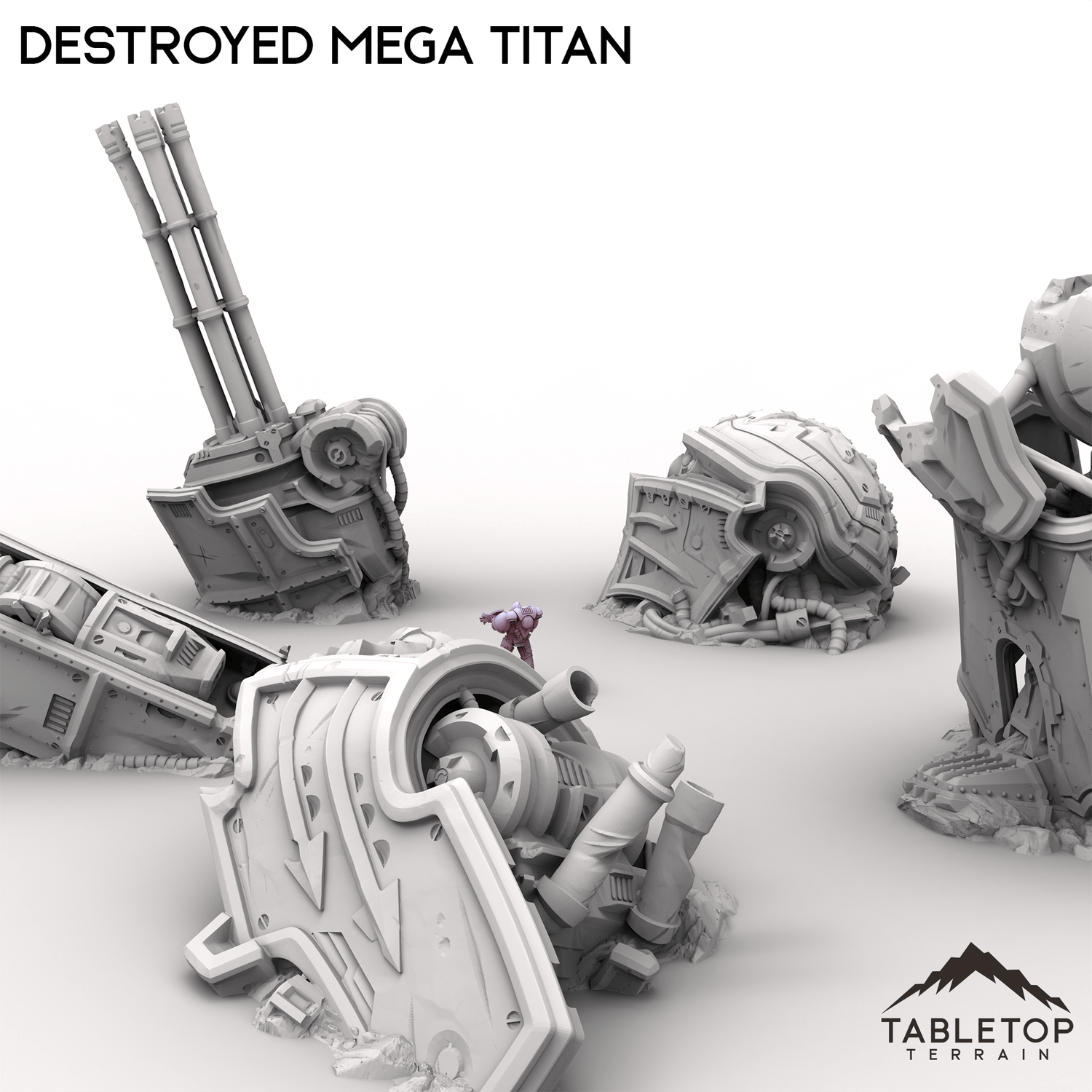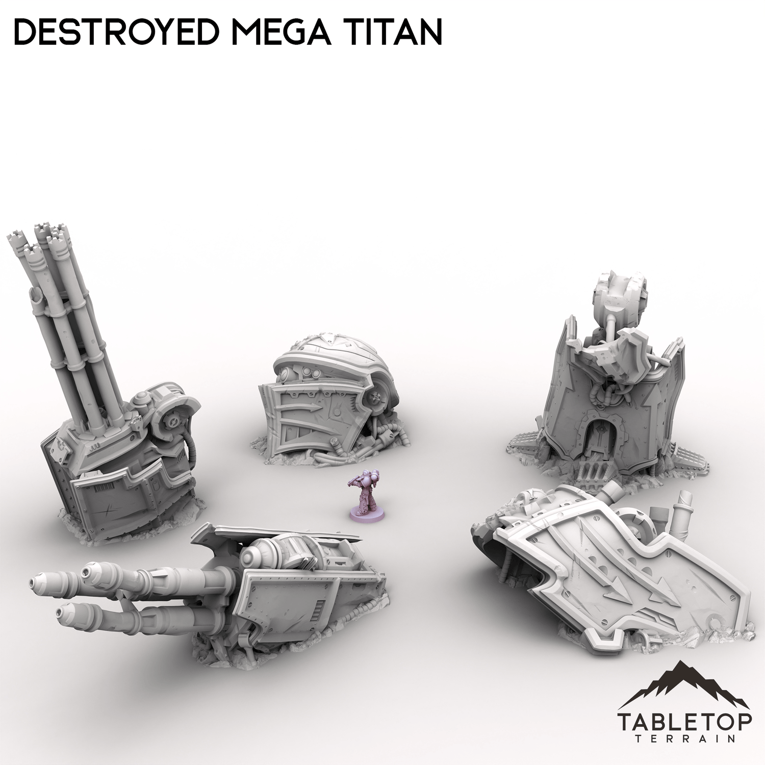 The Destroyed Mega Titan makes a dramatic battlefield centerpiece or objective marker. The shattered remains of towering cannons, broken armor plating, and ruined machinery tell the story of a colossal war machine brought down in fierce combat. Scattered across your table, these wrecked components create natural cover, tactical choke points, or narrative focal points.