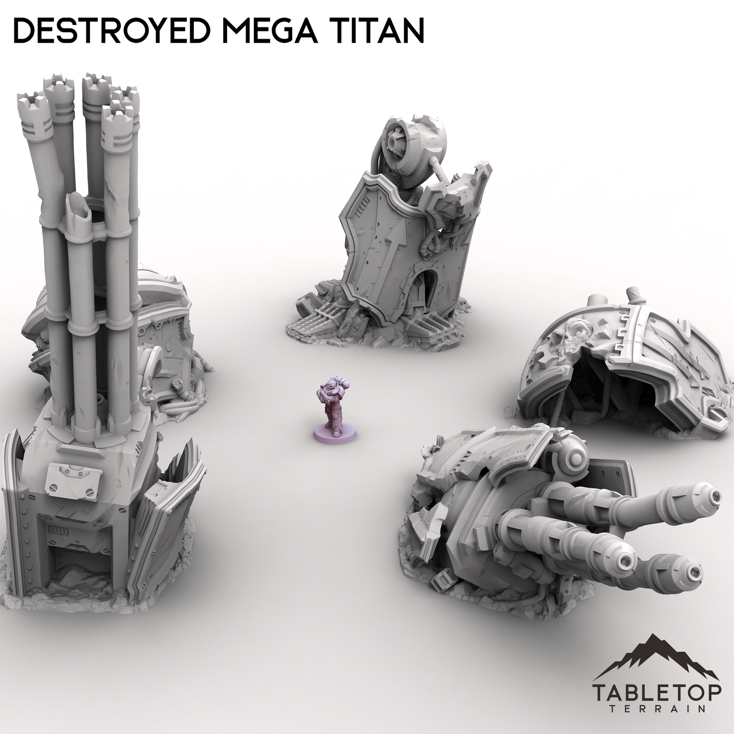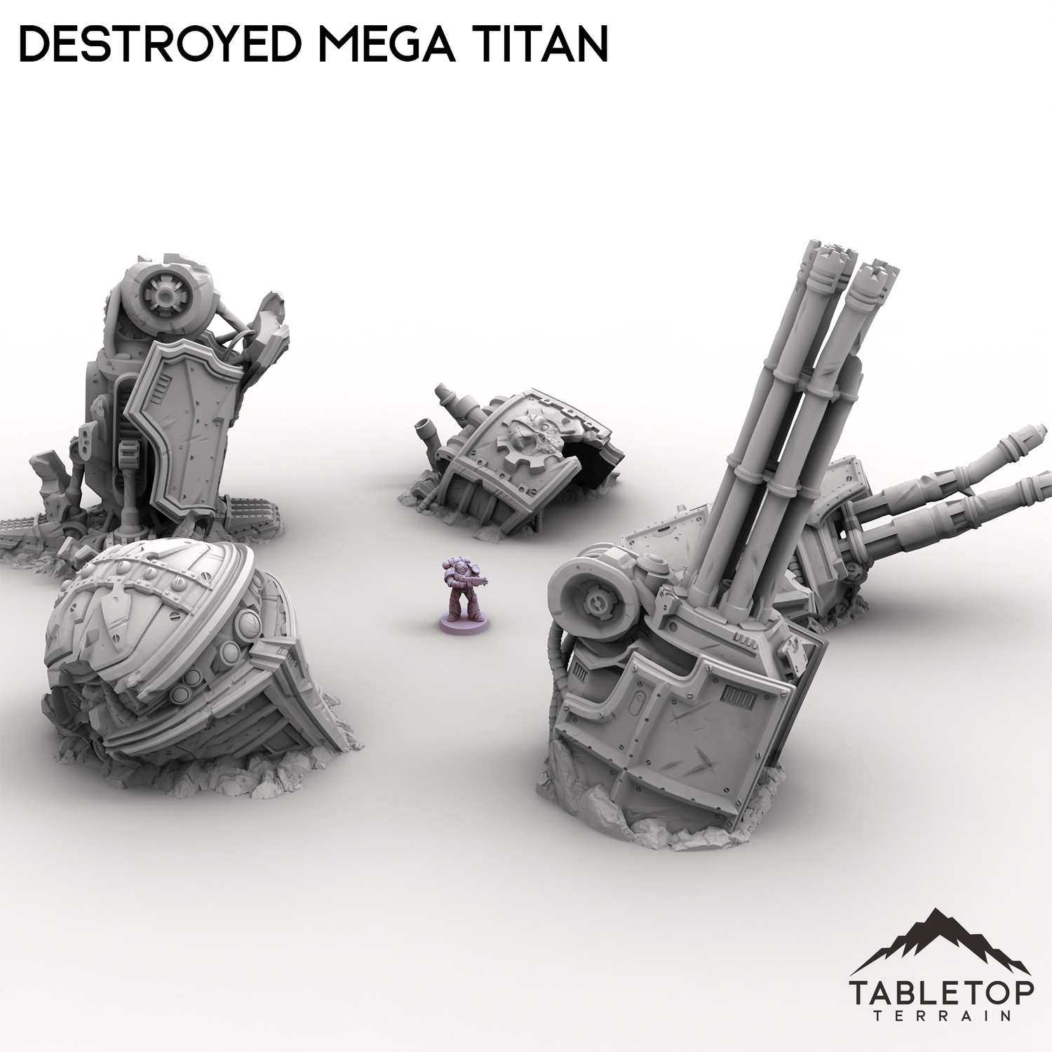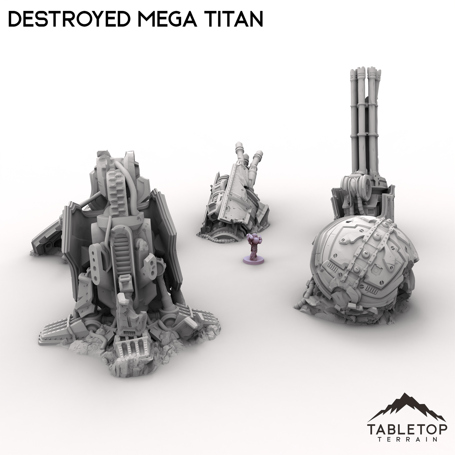 The Destroyed Mega Titan makes a dramatic battlefield centerpiece or objective marker. The shattered remains of towering cannons, broken armor plating, and ruined machinery tell the story of a colossal war machine brought down in fierce combat. Scattered across your table, these wrecked components create natural cover, tactical choke points, or narrative focal points.