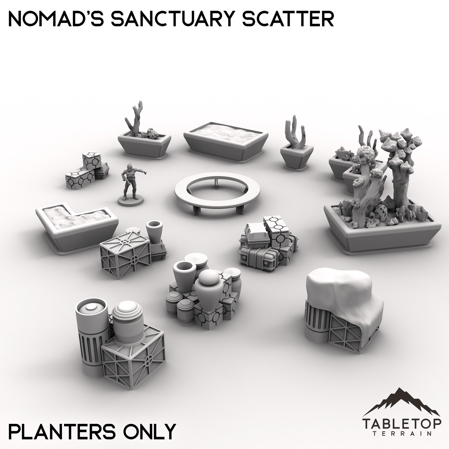 The Nomad's Sanctuary Scatter Set is a collection of trees, planters and scatter, and a round park bench. It's a themed collection for the Nomad set, but could work for a variety of uses. The Full Set item comes with a built-in discount, or you can buy either half of the set by itself. The trees come with small pegs to help in assembly, and can but should likely be glued together once painting is done. The Nomad's Sanctuary sets are all perfect for sci-fi games, cyberpunk tabletops, or desert outposts. Each building is made to be easy to setup and paint.