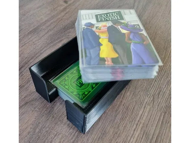 This is an organizer for the board game Ready Set Bet. It supports sleeved cards (I use 60 microns but 100 should also work) and vertical storage.