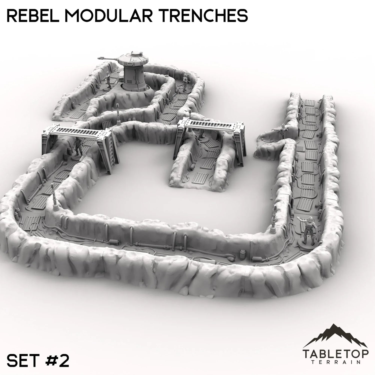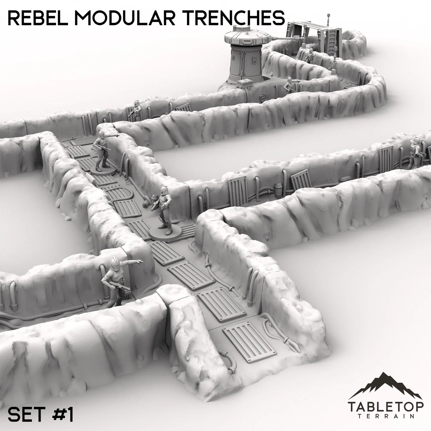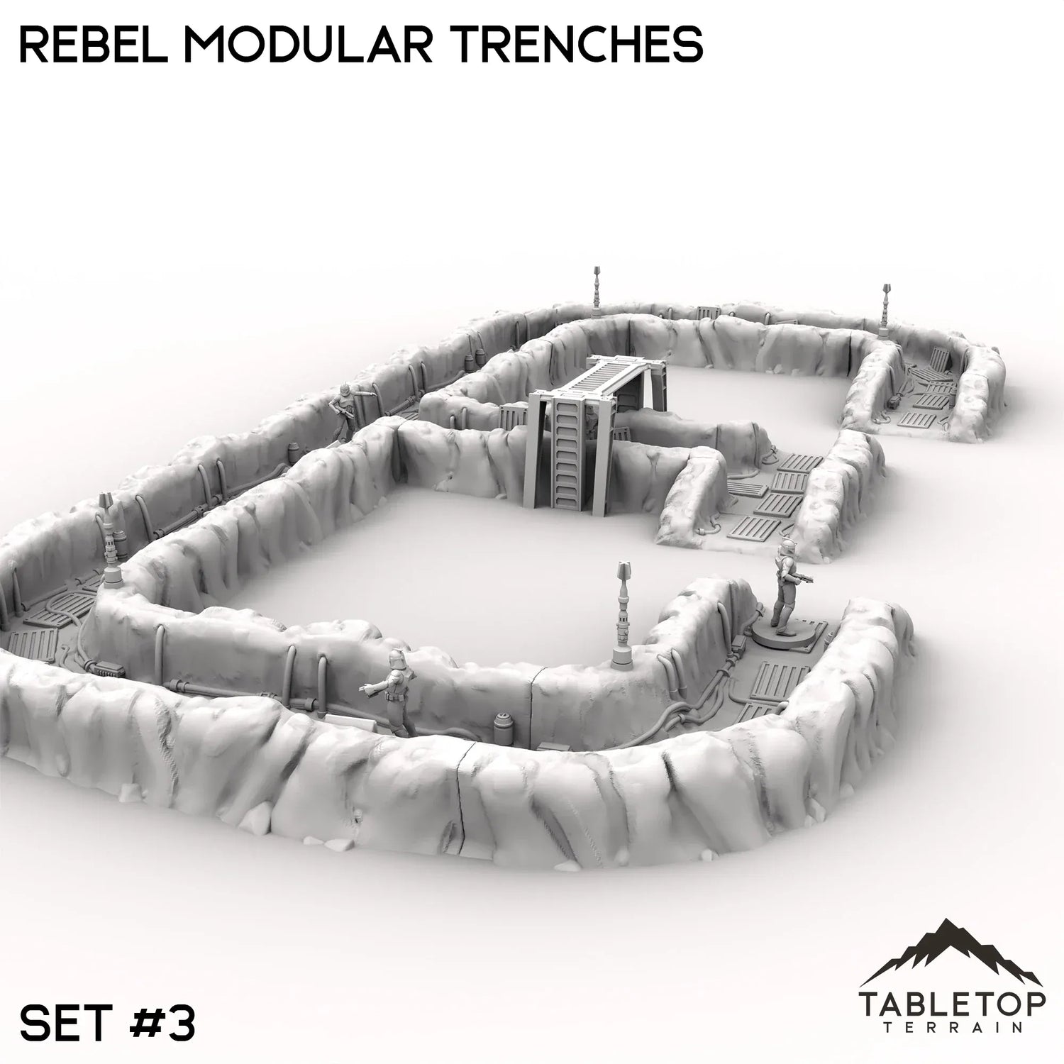 The Rebel Modular Trenches features different styles and arrangements of snowy corridors lined with wires and metal platforms. The trenches come in 3 different sets of pieces. The photos show the pieces for each set, put together into an example arrangement. Set #1 includes 2 defense turrets, Set #2 includes 1 turret, and Set #3 includes no turrets.