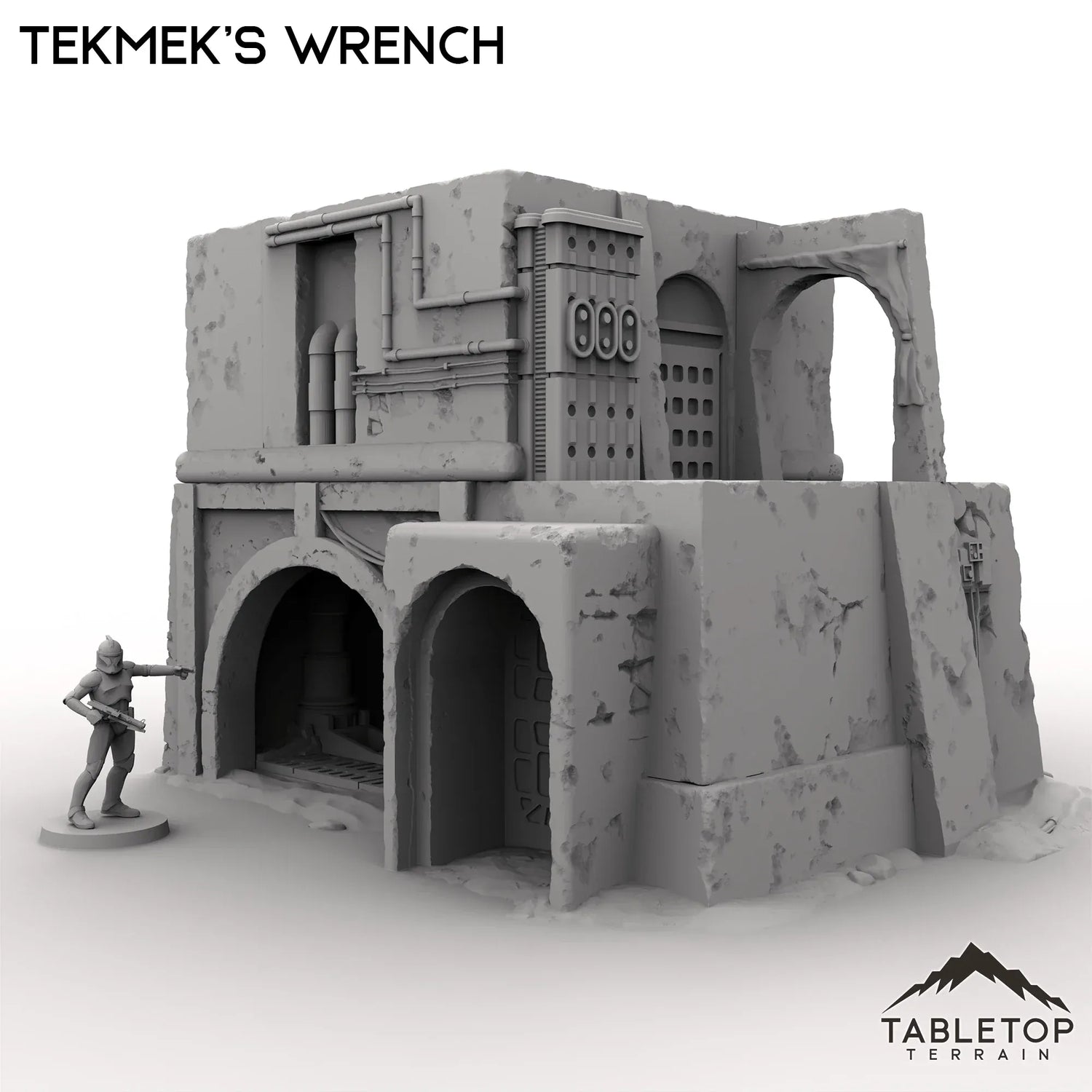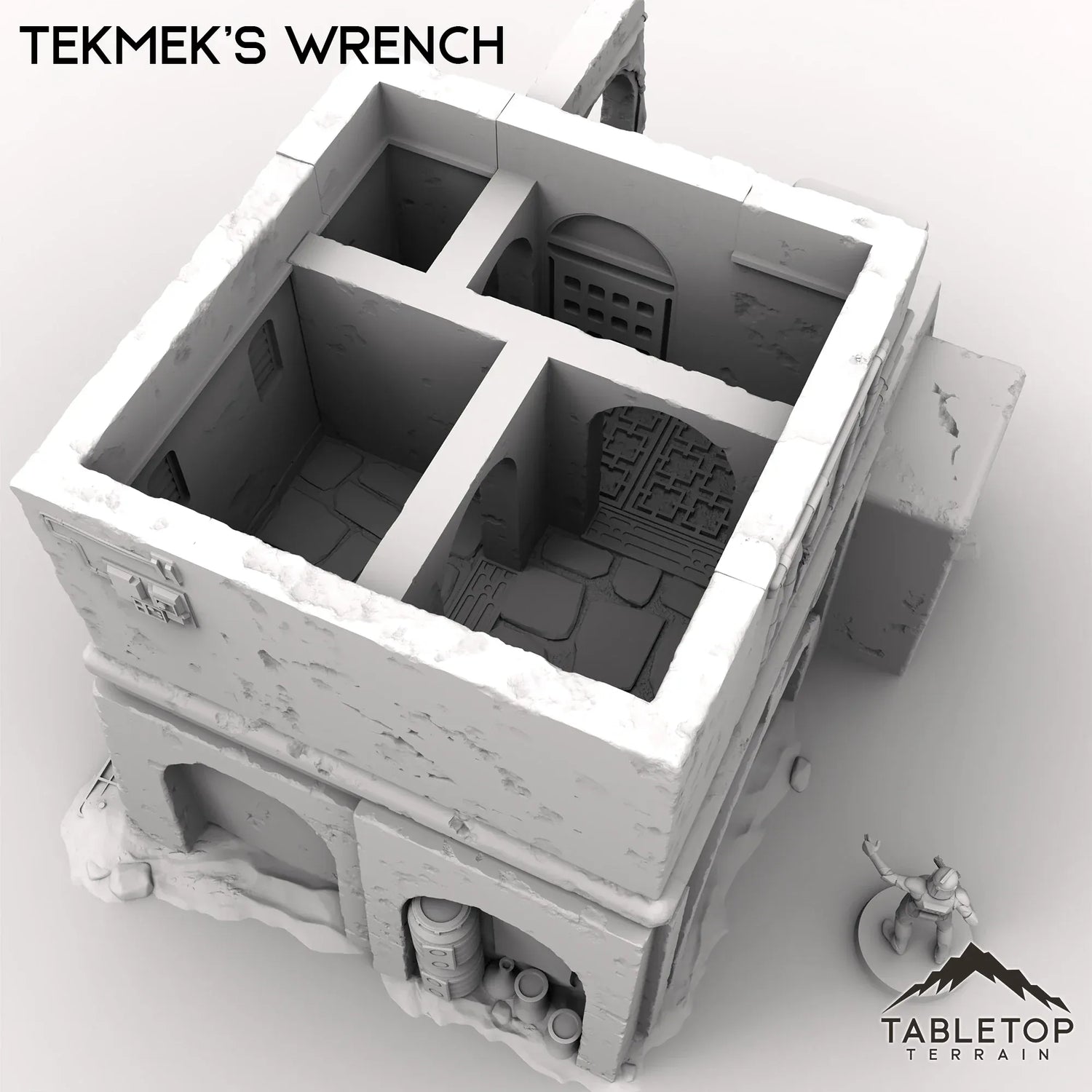 Tekmek's Wrench is a ramshackle, multi-level workshop that looks like it’s been patched together as many times as the machines inside. Its reinforced walls and external piping suggest a busy tinker has been at work. Perfect for a meeting spot, a repair shop, or just a place to hunker down when things get rough.
