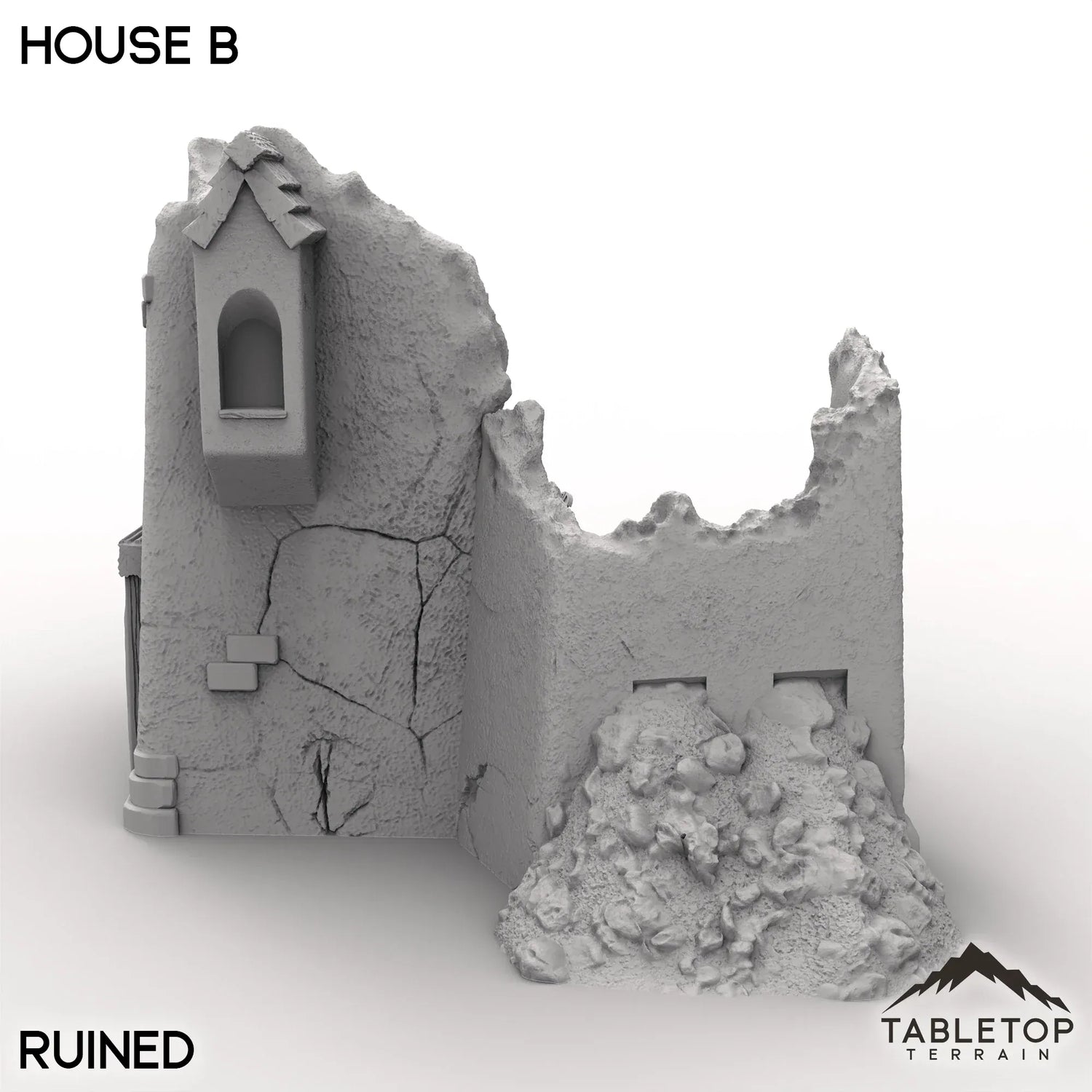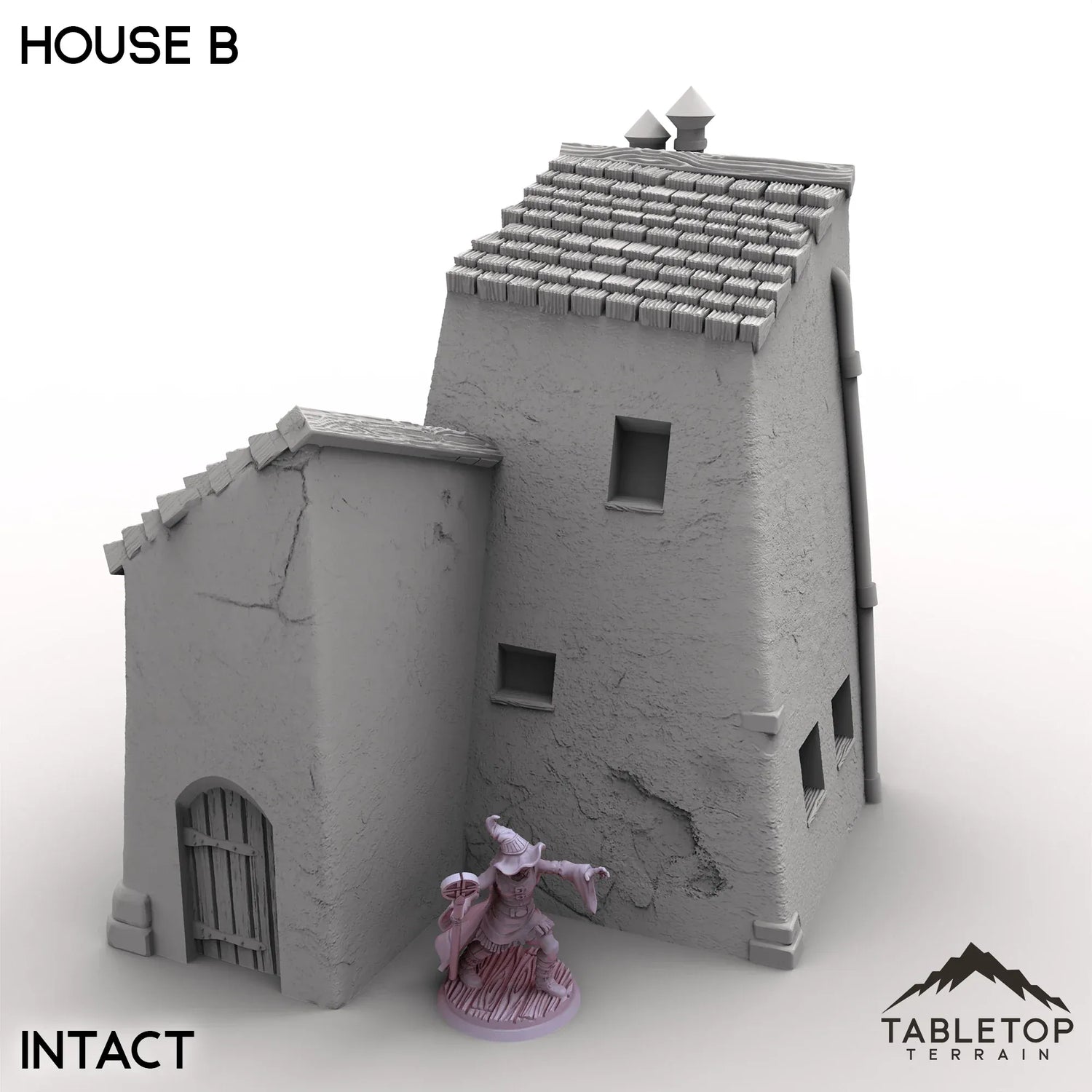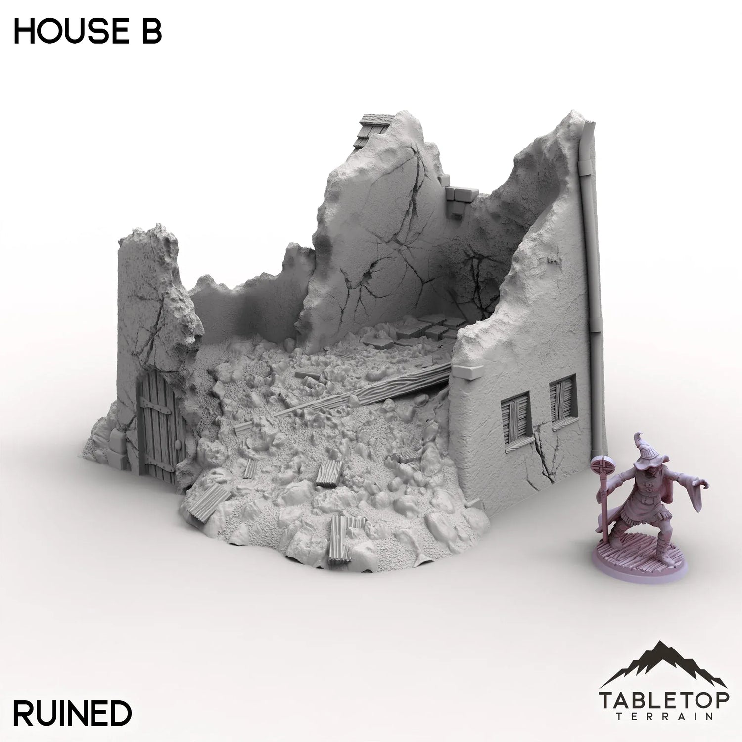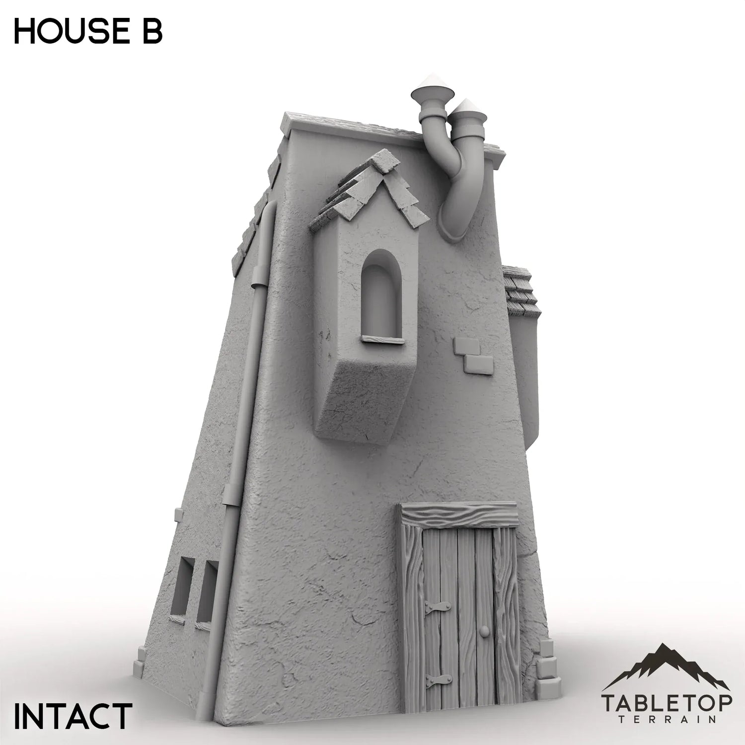 This crooked house, part of the Vexed Village set, has walls that lean and twist as if bent by strange magic. Its small uneven angles hide windows that peek out like eyes - while a wonky chimney juts out near the top. This house is available in either intact or ruined variant. Perfect as either part of the Vexed Village or standing alone as some bizarre witch’s house.
