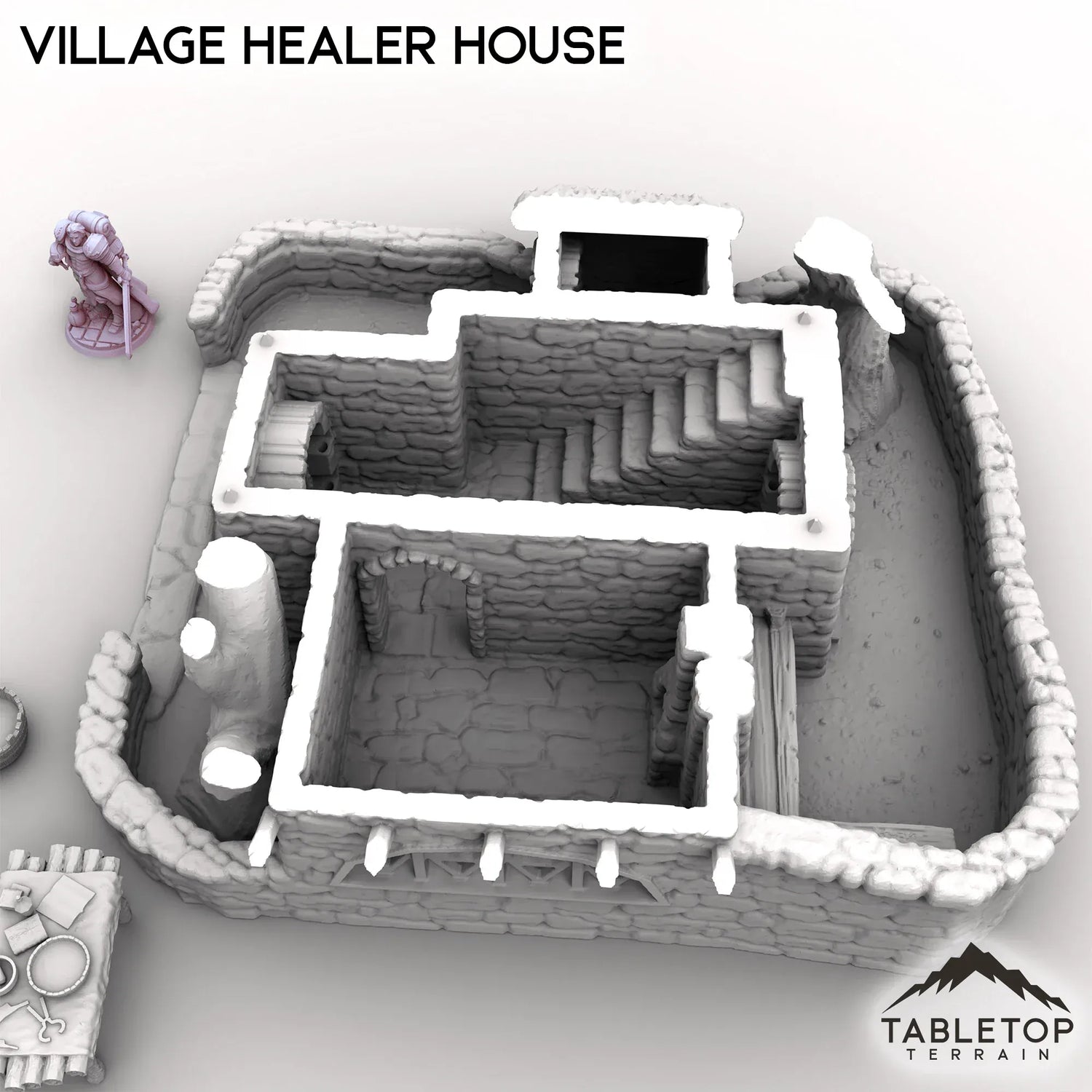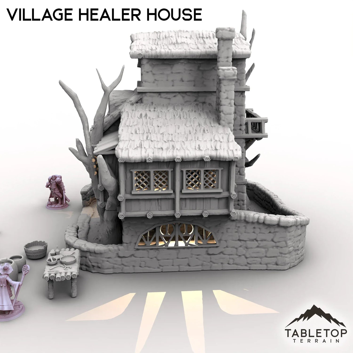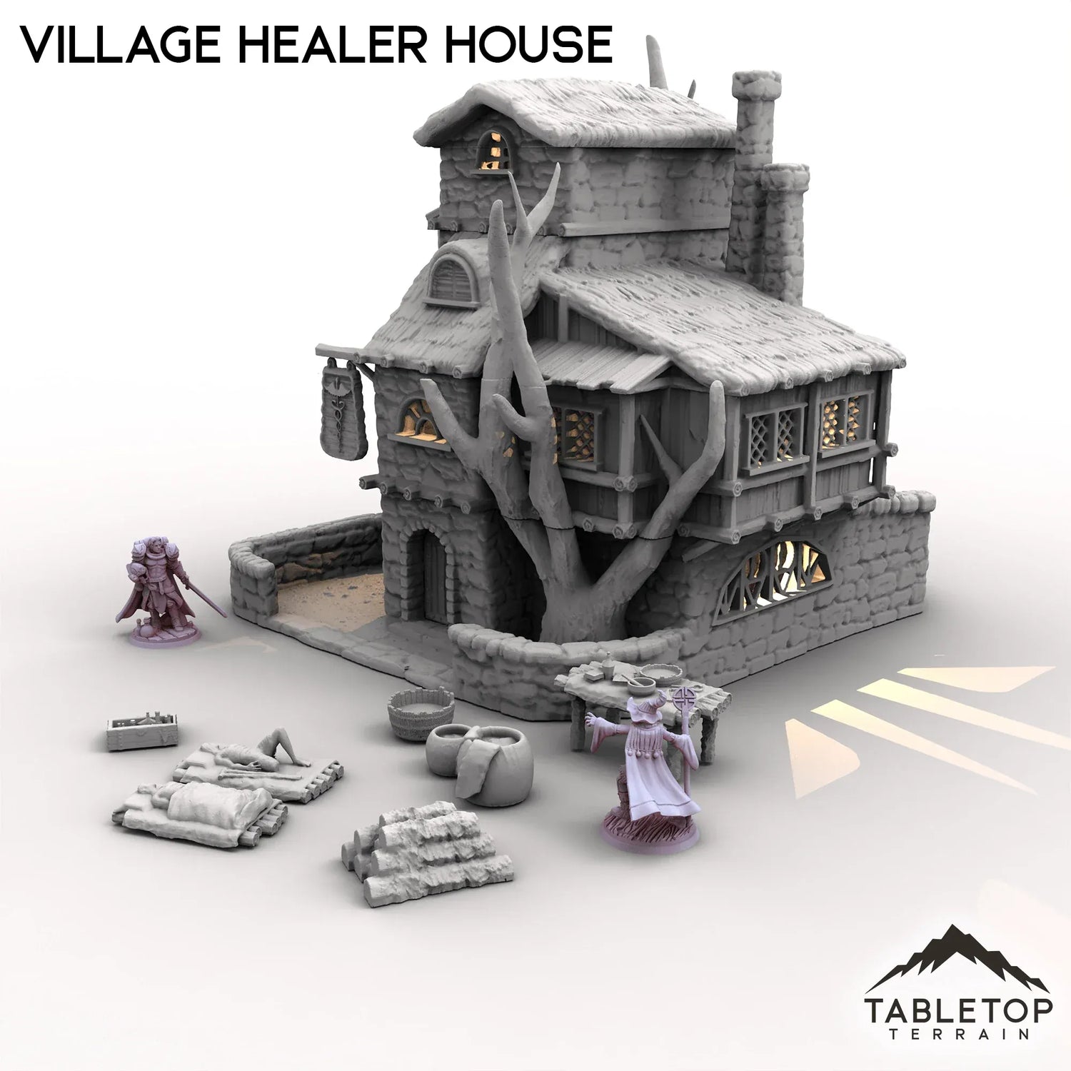 The Village Healer’s House is a cozy, timber-framed building with a thatched roof for selling herbs and remedies. Smoke drifts from its chimneys, and a wooden table outside holds mortar, pestle, and drying plants. Patients lie nearby on wooden stretchers awaiting aid.