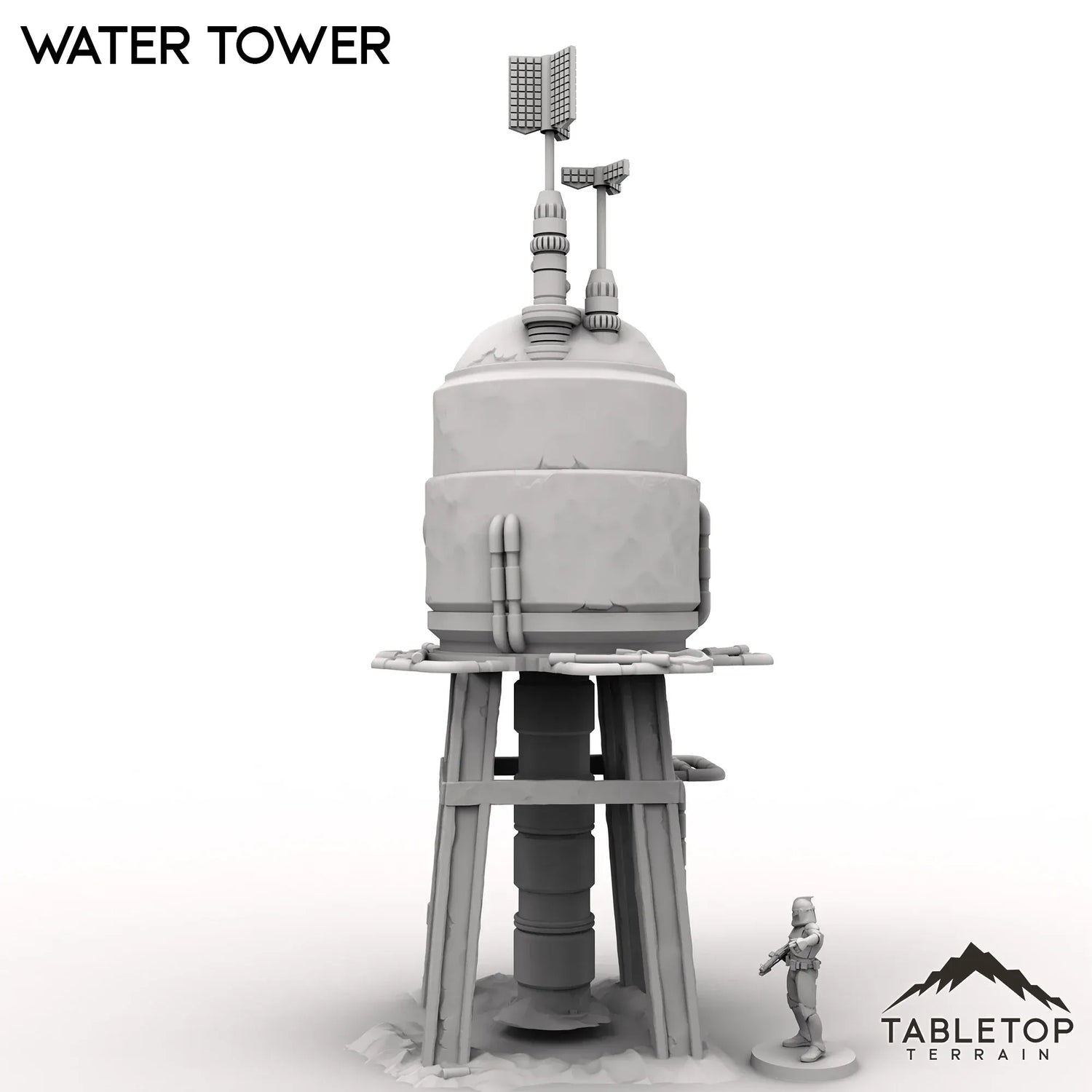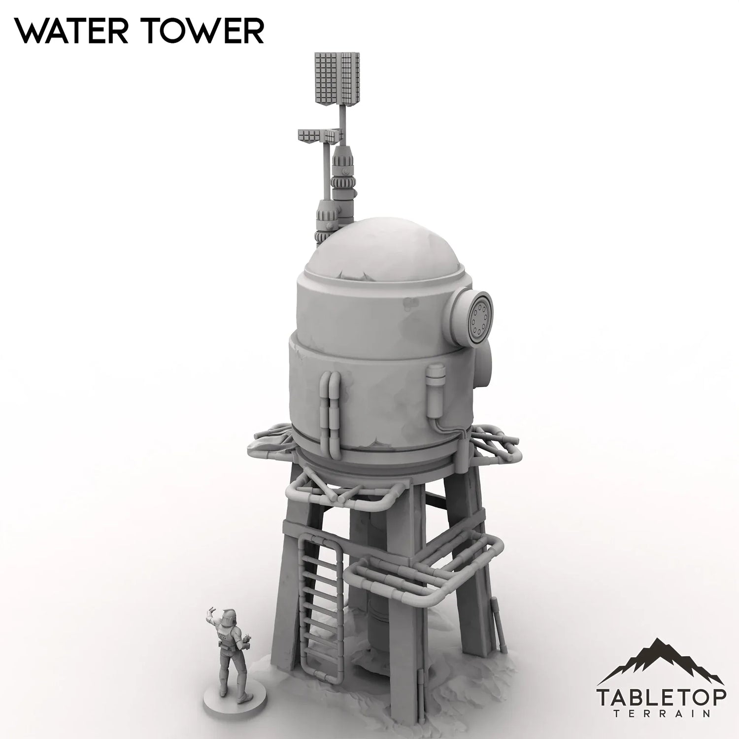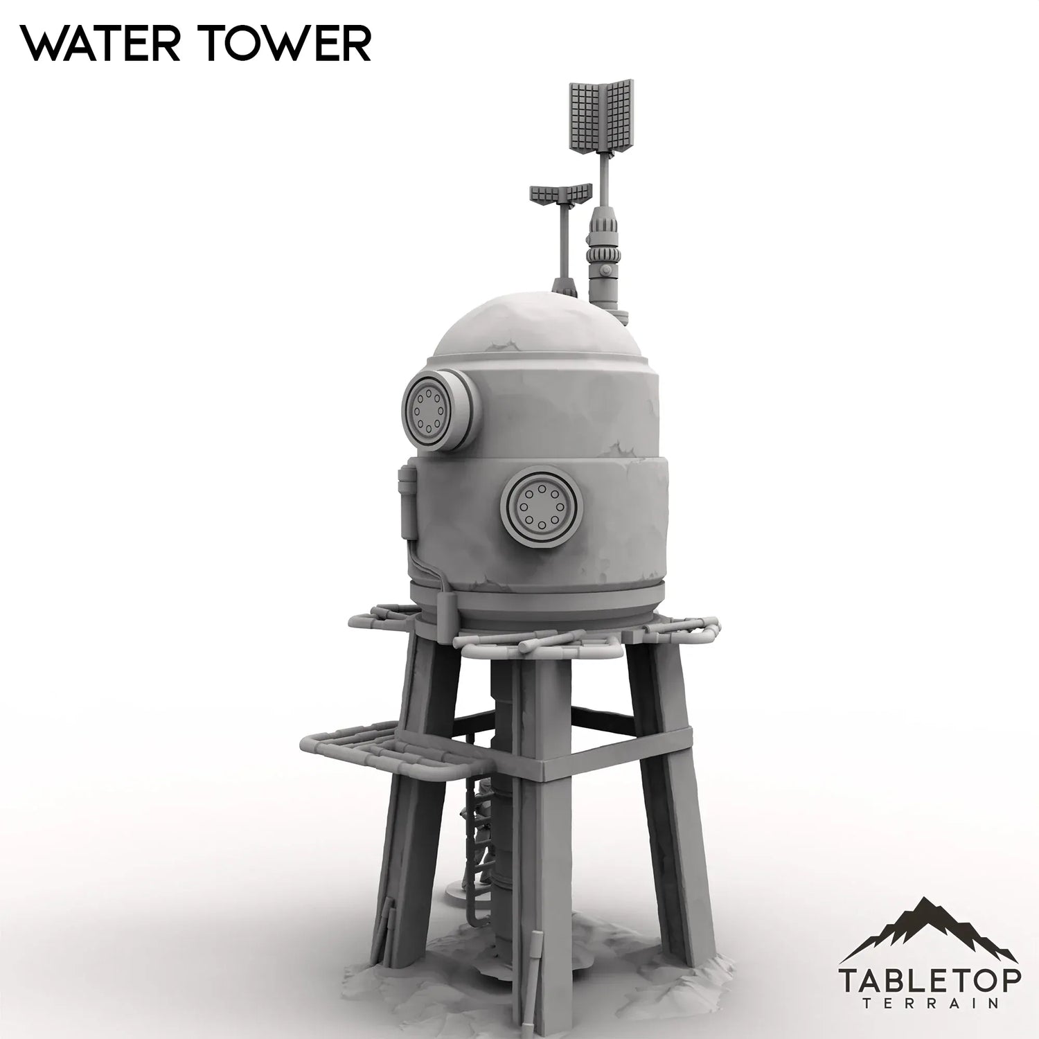 The water tower stands tall against the arid landscape, its sturdy frame supporting a large reservoir vital for survival in the harsh environment. A pipe runs to its base to supply the water that keeps nearby settlements thriving. Weathered by time and dust, the tower serves as both a beacon of sustenance and a reminder of the ingenuity needed to endure the wasteland.