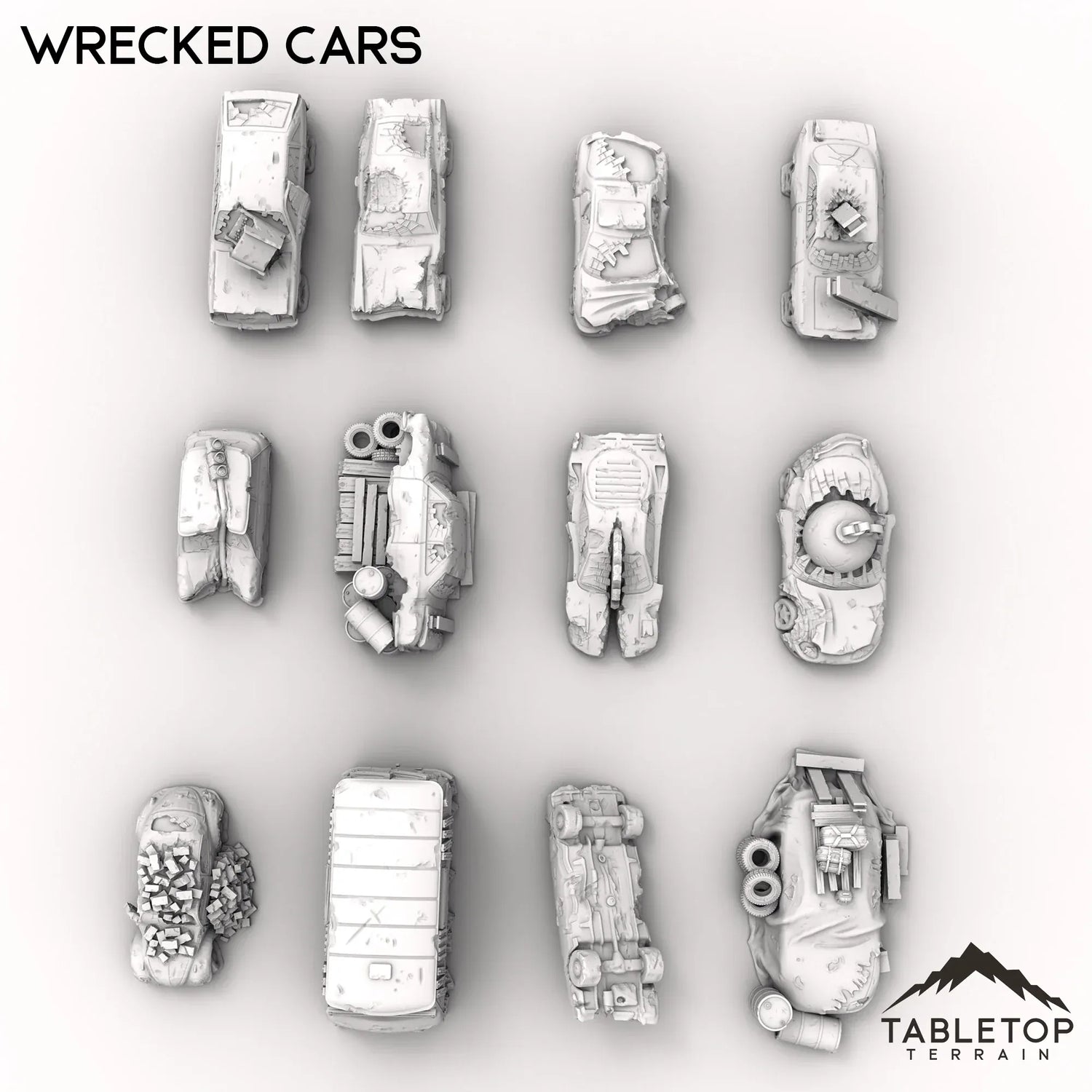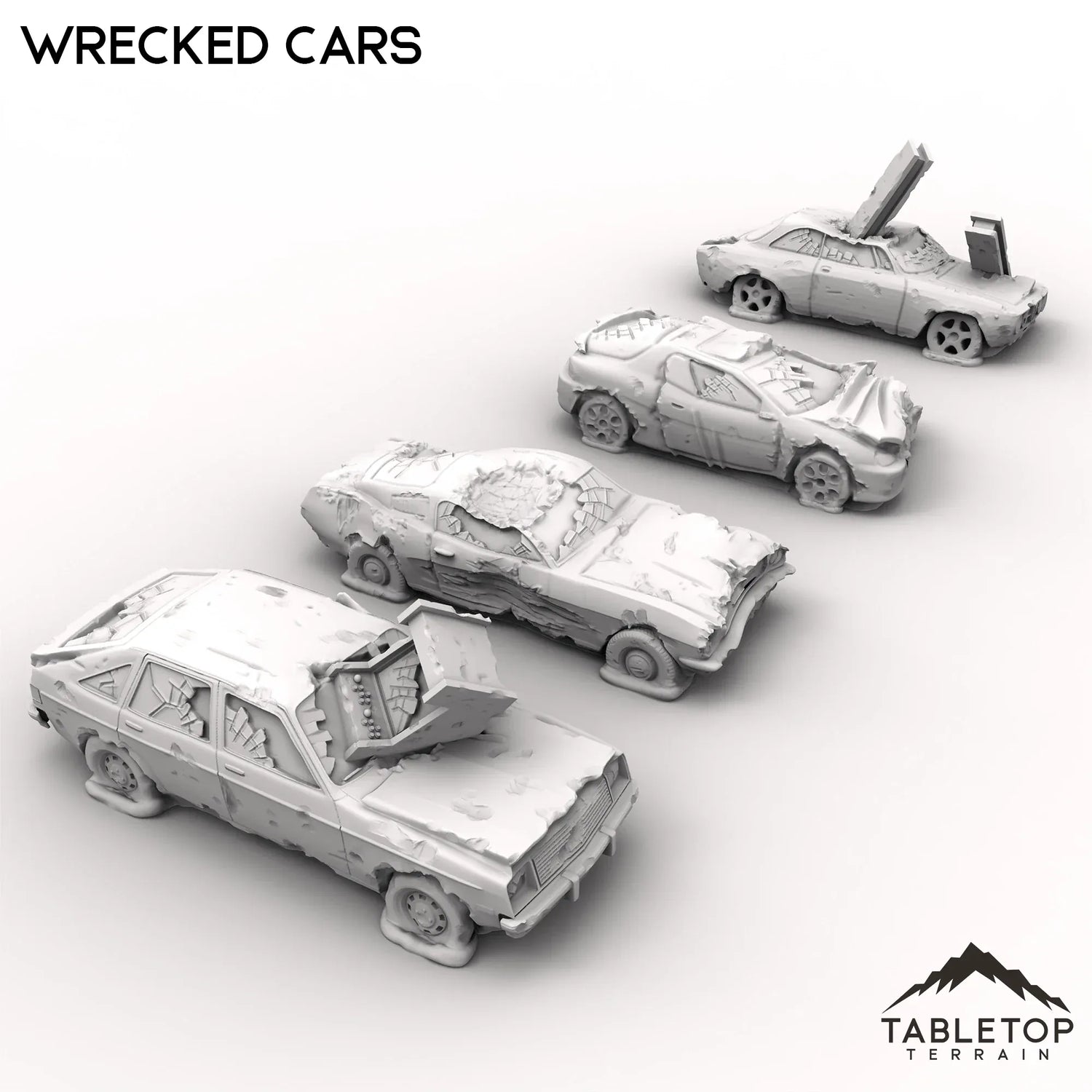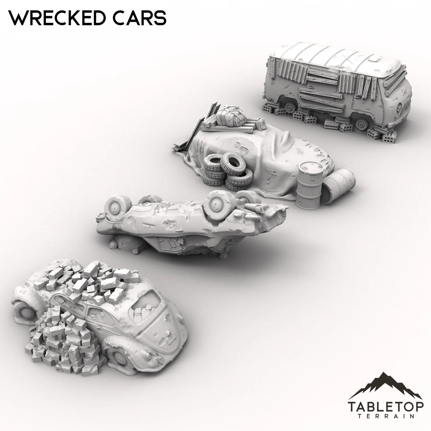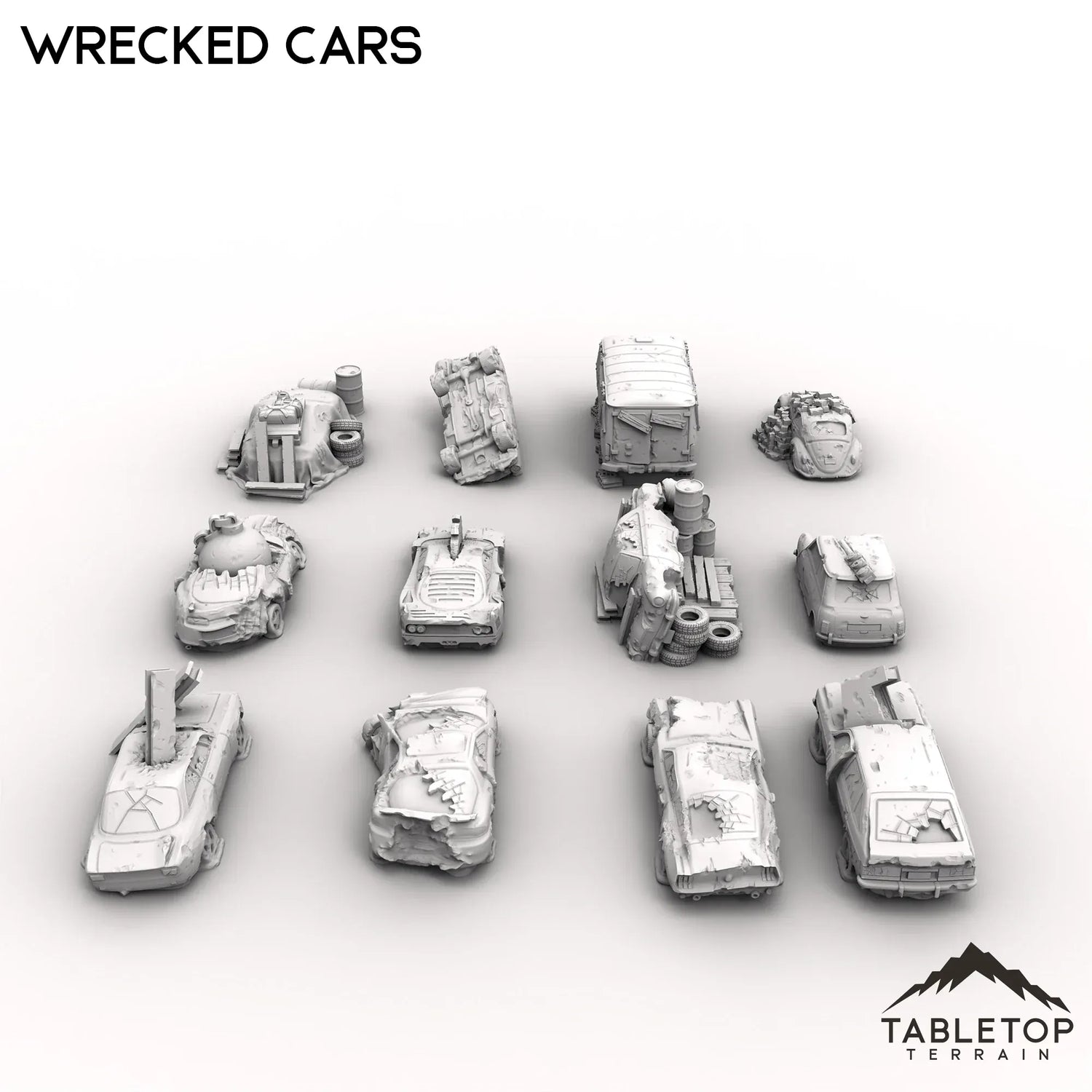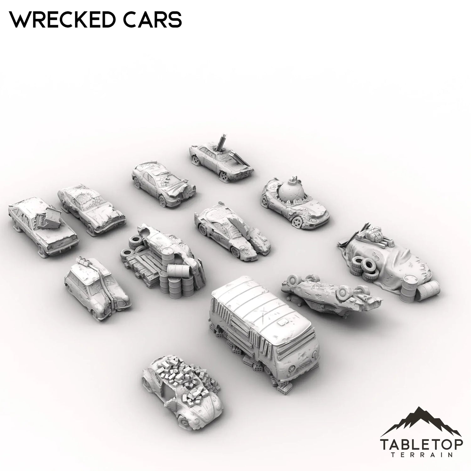 A field of ruined vehicles, this set features 12 different cars that have been left as junk to rust away. Maybe this is a wasteland reminder of what once was, or perhaps just a junkyard in an otherwise bustling city. The wrecked cars come in a variety of scales. The 40mm scale is compatible with large scale games such as MCP. The 32mm scale is slightly smaller and compatible with games such as Fallout Wasteland Warfare or Cyberpunk Red. The 28mm scale is compatible with a variety of game systems. The 20mm scale is designed to be compatible with Gaslands.